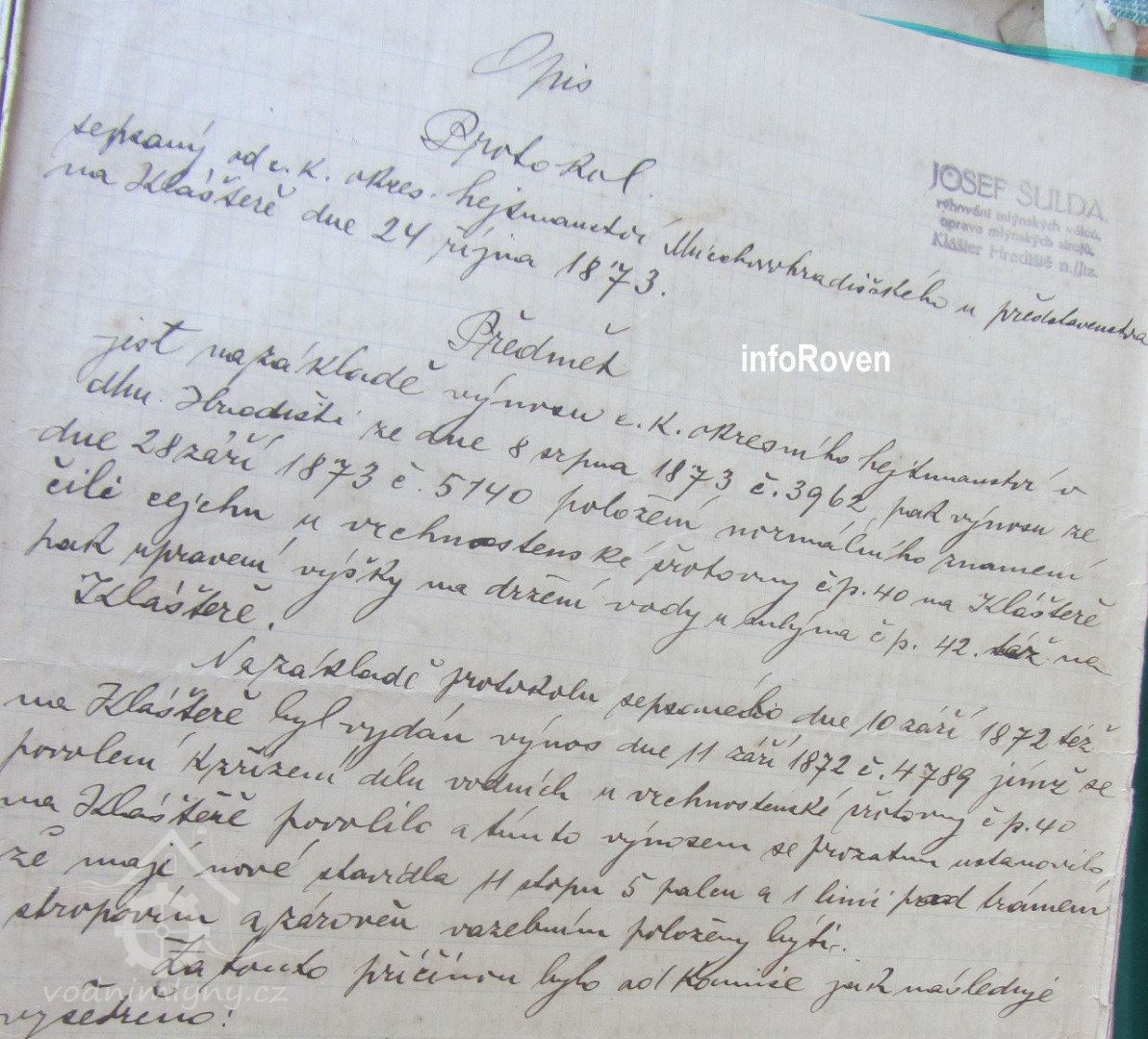 1923 zaslala firma Josefa Šuldy - rýhování mlýnských válců a oprava mlýnských strojů - na Okresní úřad v Mnichově Hradišti žádost o povolení provozování strojnické dílny a mlýna barev, vápna, hlinky, cementu a kostí v čp. 40.