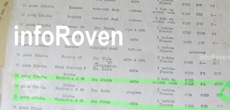 V roce 1930 zde byla 1 Francisova turbína, hltnost 0,3 m3/s, spád 0,863 m, výkon 2,2 HP.