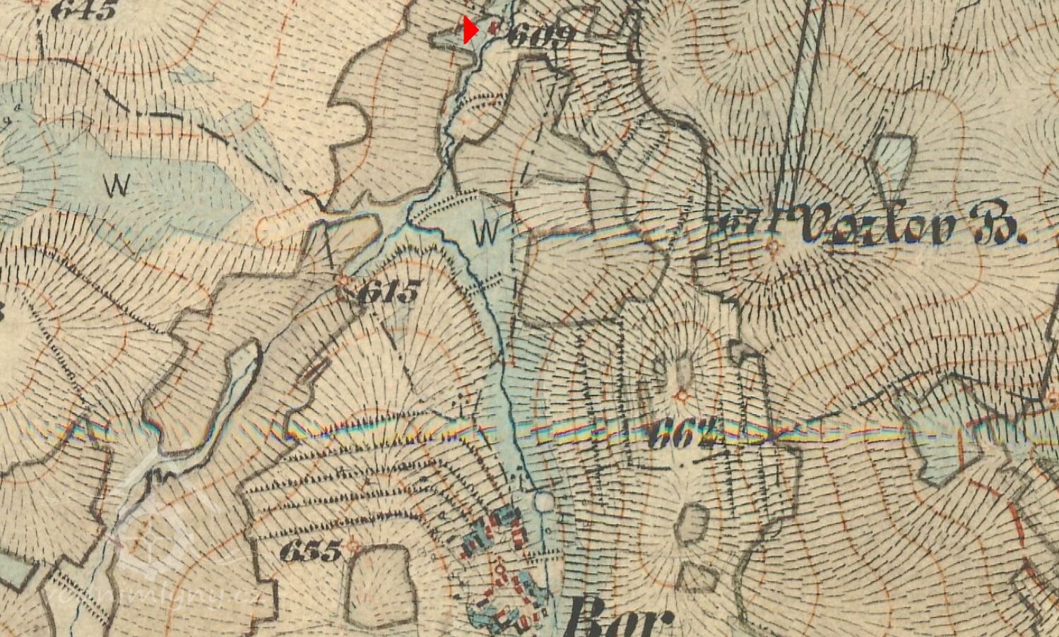 Mlýn čp.18 v Boru tzv. Kulíkův mlýn dostává vodu potokem tvořeným pramenem přitékajícím od Boru a od Grünwaldu. Potok ten vtéká do nádržky asi 2 míry veliké bez stavidel. Z nádržky vede se voda ke mlýnu strouhou do vantrok 2 m dlouhých asi 78 cm širokých a 50 cm hlubokých. Voda nadržuje se vlastně pouze ve strouze stavidlem mezi strouhou a troubou. Do vantrok vtéká voda ze strouhy troubou 34 cm širokou a 24 cm vysokou. Z vantrok jde voda do žlabu 34 cm širokého, 24 cm hlubokého a 2 m dlouhého.