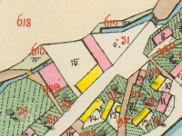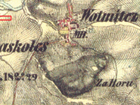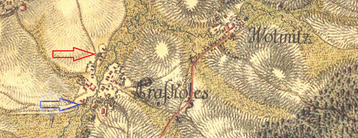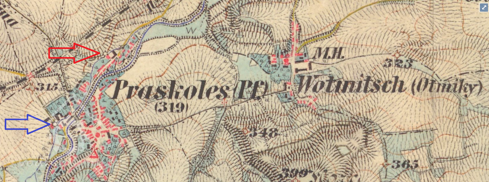 1873: Leží na levém břehu Červeného potoka. Voda k mlýnu přichází z Horního mlýna praskoleskéhp strouhou do vantrok. Vantroka jsou 5,6 m dlouhá, 2,5 m široká a 0,75 m vysoká a v nich je umístěn 1 budník a 3 stavítka. Budník má 0,45 m na kvadrát. Voda od kol odpadající odtéká pod mlýnskou strouhou opět do Jalového potoka.