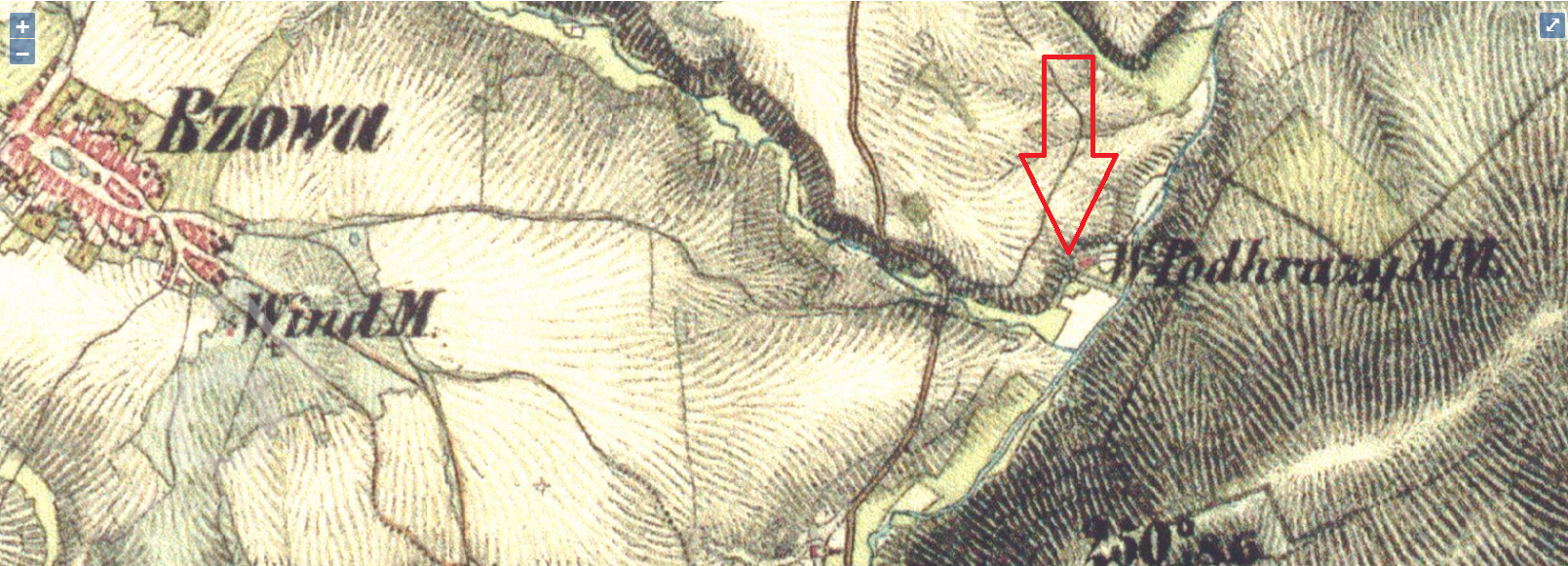 Mlýn u křižovatky mezi Točníkem, Březovou a Bzovou, provoz ukončil patrně již před rokem 1840.