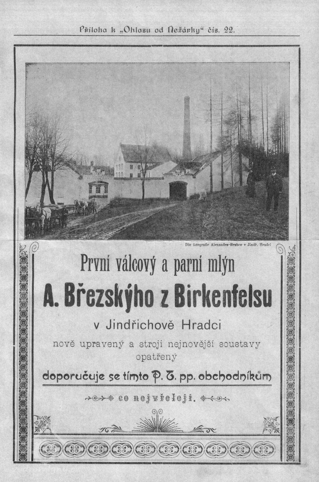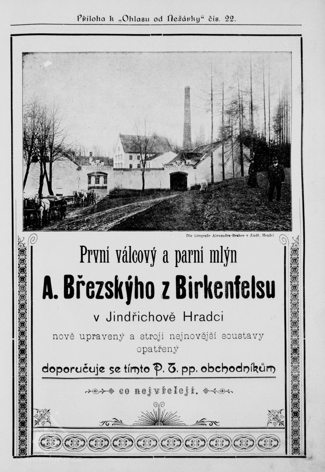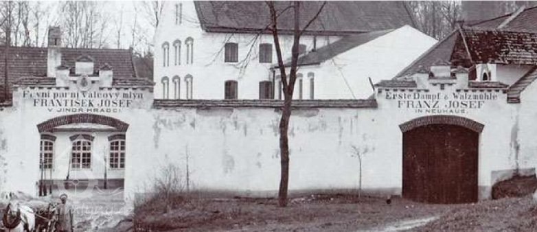 Z doby kolem r. 1900 (1895?) je dochována fotografie s označením mlýna jako "První parní válcový mlýn FRANTIŠEK JOSEF v JINDR. HRADCI + Erste Dampf. & Walzmühle FRANZ JOSEF IN NEUHAUS"