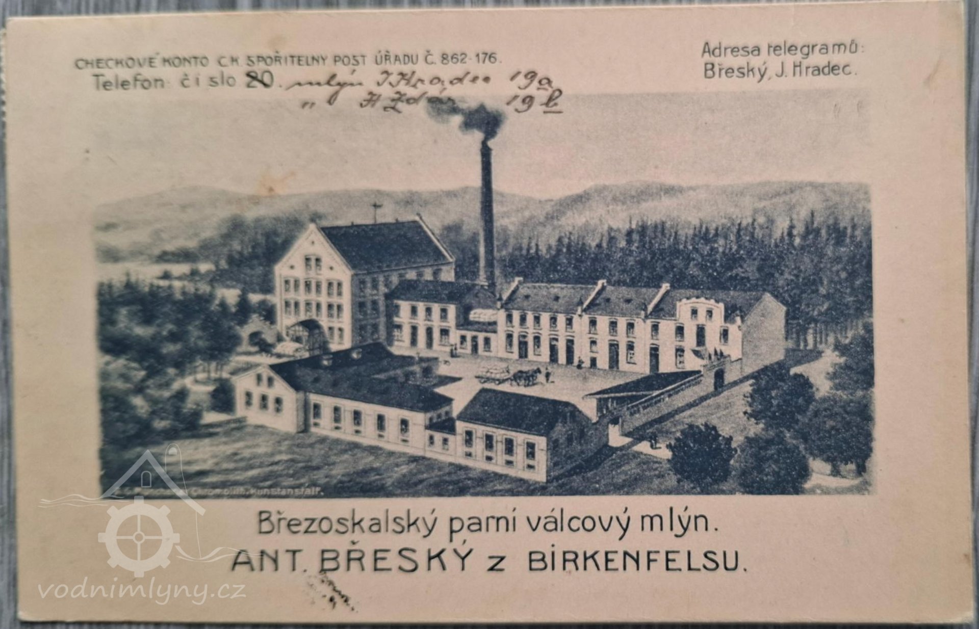 3. 8. 1900 zakoupil mlýn Antonín Břeský (*1875), po něm mlýn převzal jeho syn Antonín (*1905). Otec Antonína Břeského (*1875), také Antonín (*1831) ve svém Zápisníku uvádí: „Přijdouce sem z Třeboně na mlýn dne 3. srpna 1900, který dle našeho predikátu shodujícím se zde ve významu s množstvím bříz a skal, od nás Březoskalský nazván a také protokolován byl."