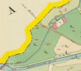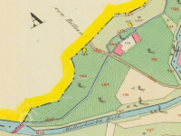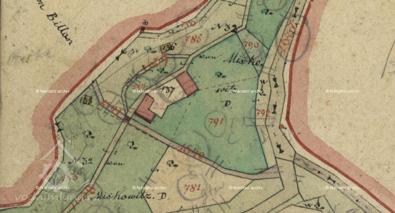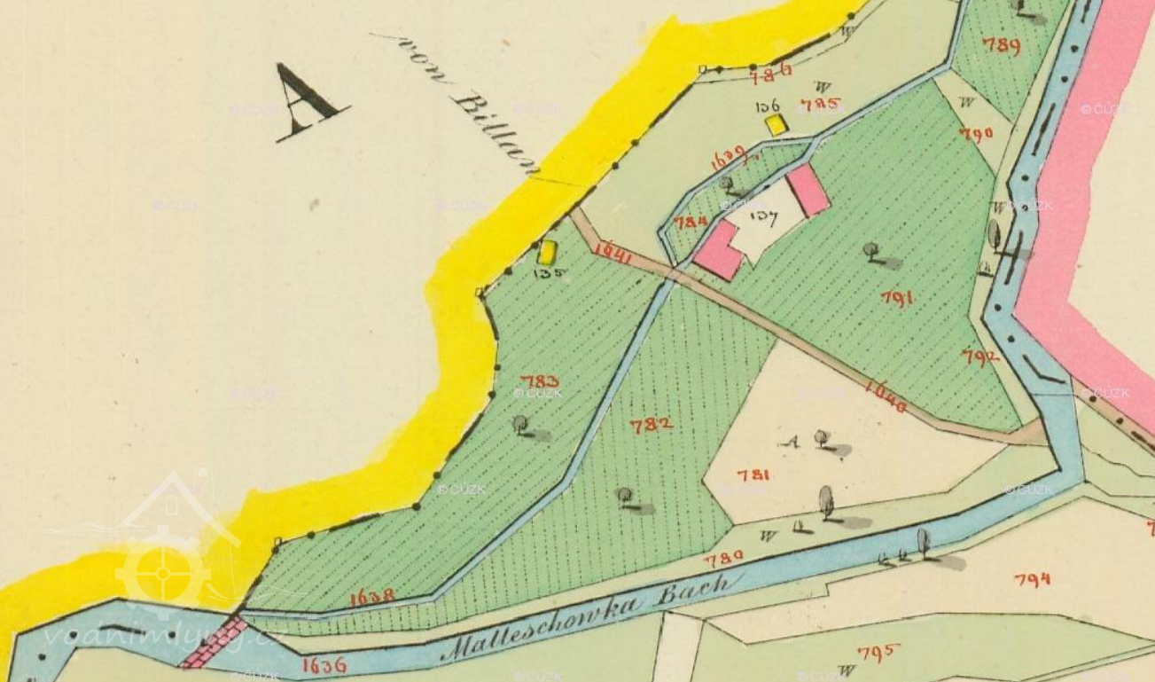 Mlýn na nejsevernějším výběžku malešovského katastru, v pol. 19. stol. zatopený vodou Velkého (Obického) mlýna.