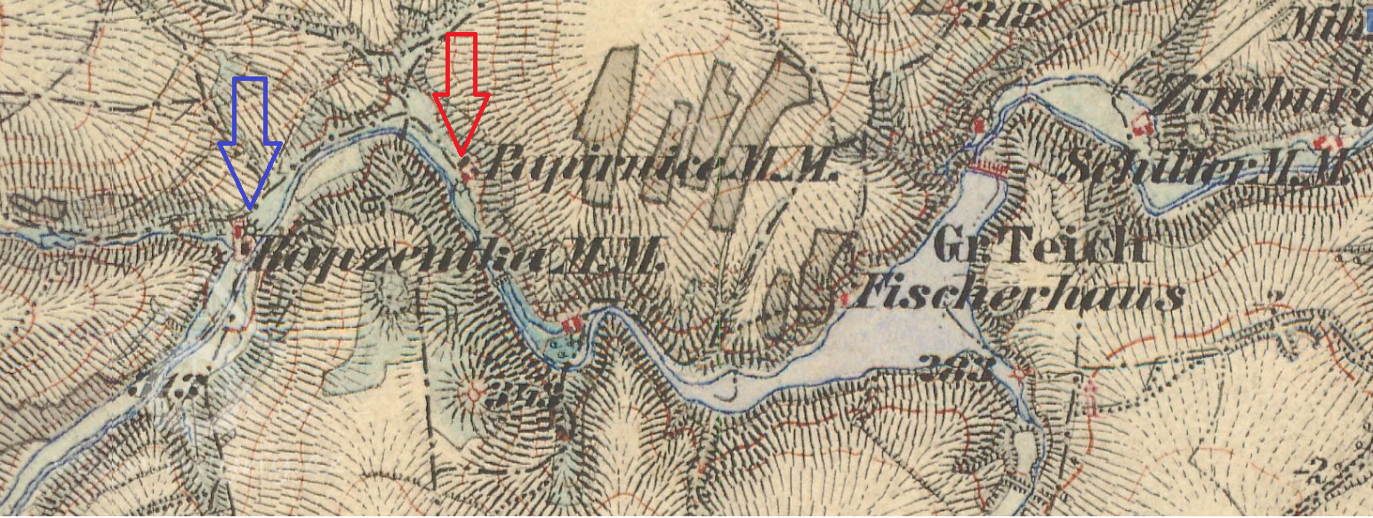 Mlýn doložený již v 2. polovině 16. stol., v letech 1966-1970 zatopený vodou přehrady Vrchlice, pozůstatky mlýna leží těsně u hráze.
