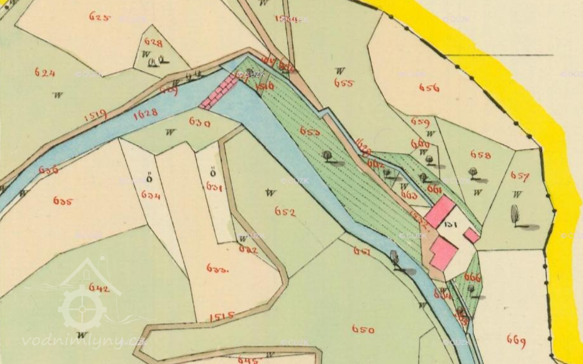 Popis1930: 1 kolo na svrchní vodu, hltnost 0,1 m3/s, spád 4,2 m, výkon 2,3 HP