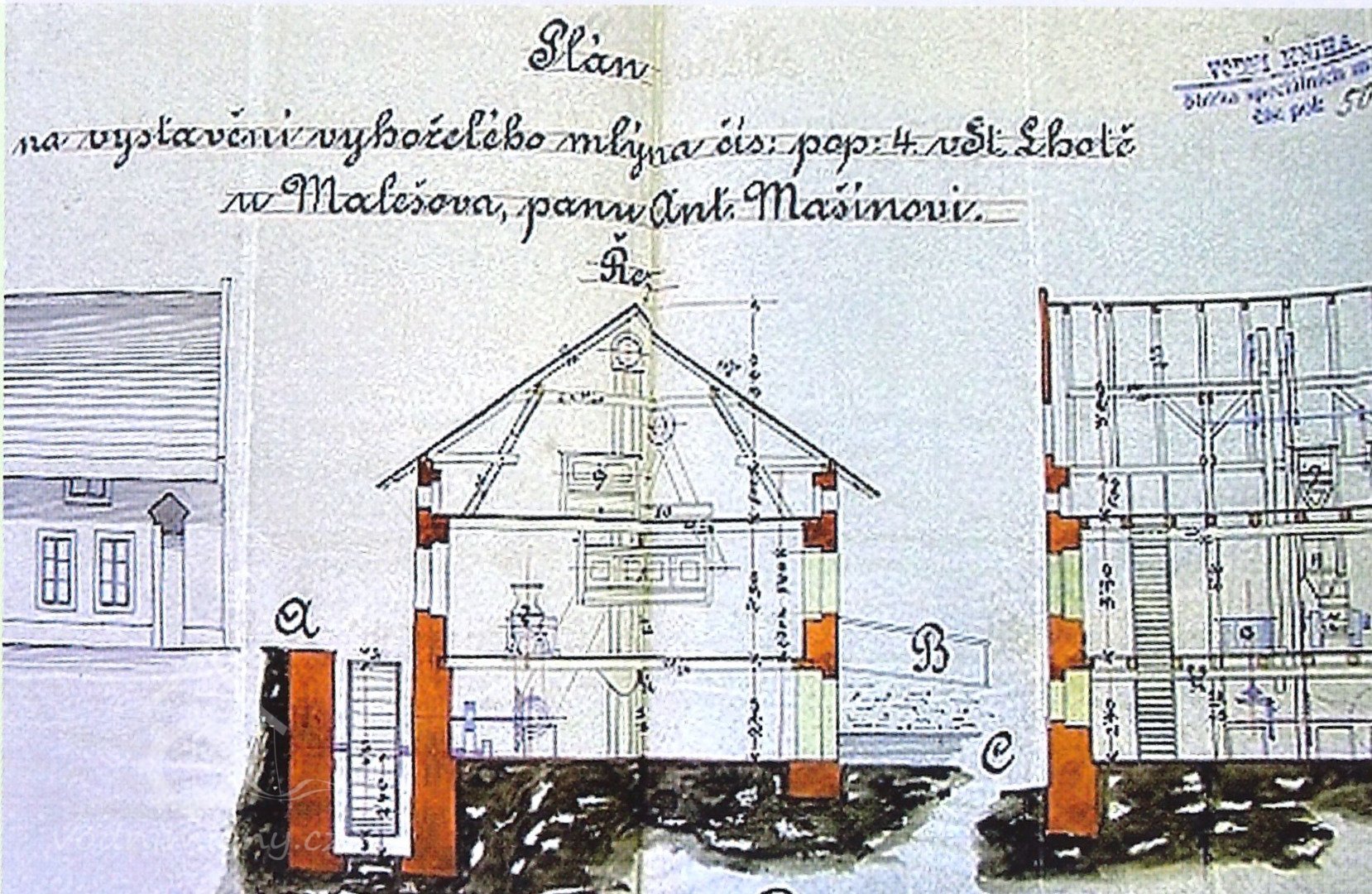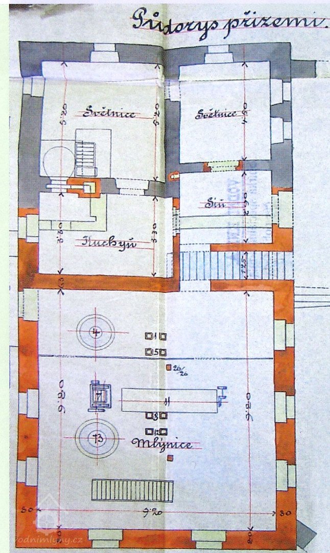 Popis1930: kolo na svrchní vodu, hltnost 0,115 m3/s, spád 4,3 m, výkon 4,5 HP