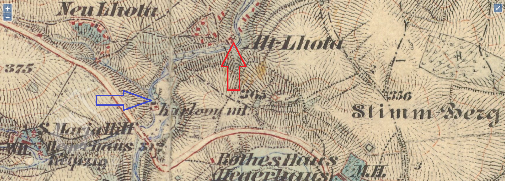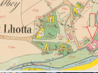 Přímo v centru zaniklé Staré Lhoty, 600 m východně od dosud existující Nové Lhoty