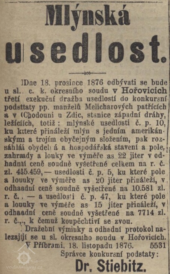 Do konce roku 1876 patřil mlýn manželům Melicharovým, pak byl nabízen v dražbě. (RR)