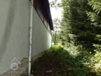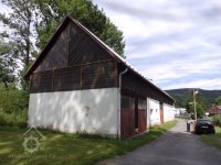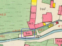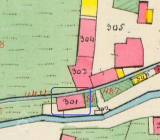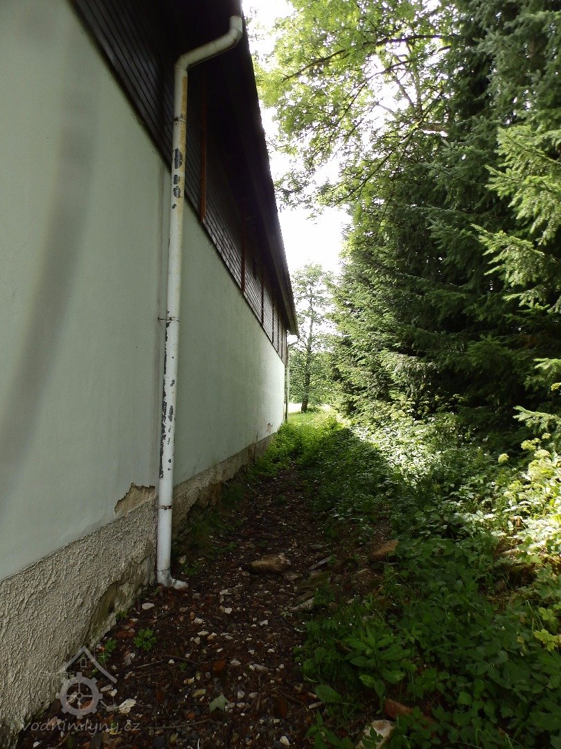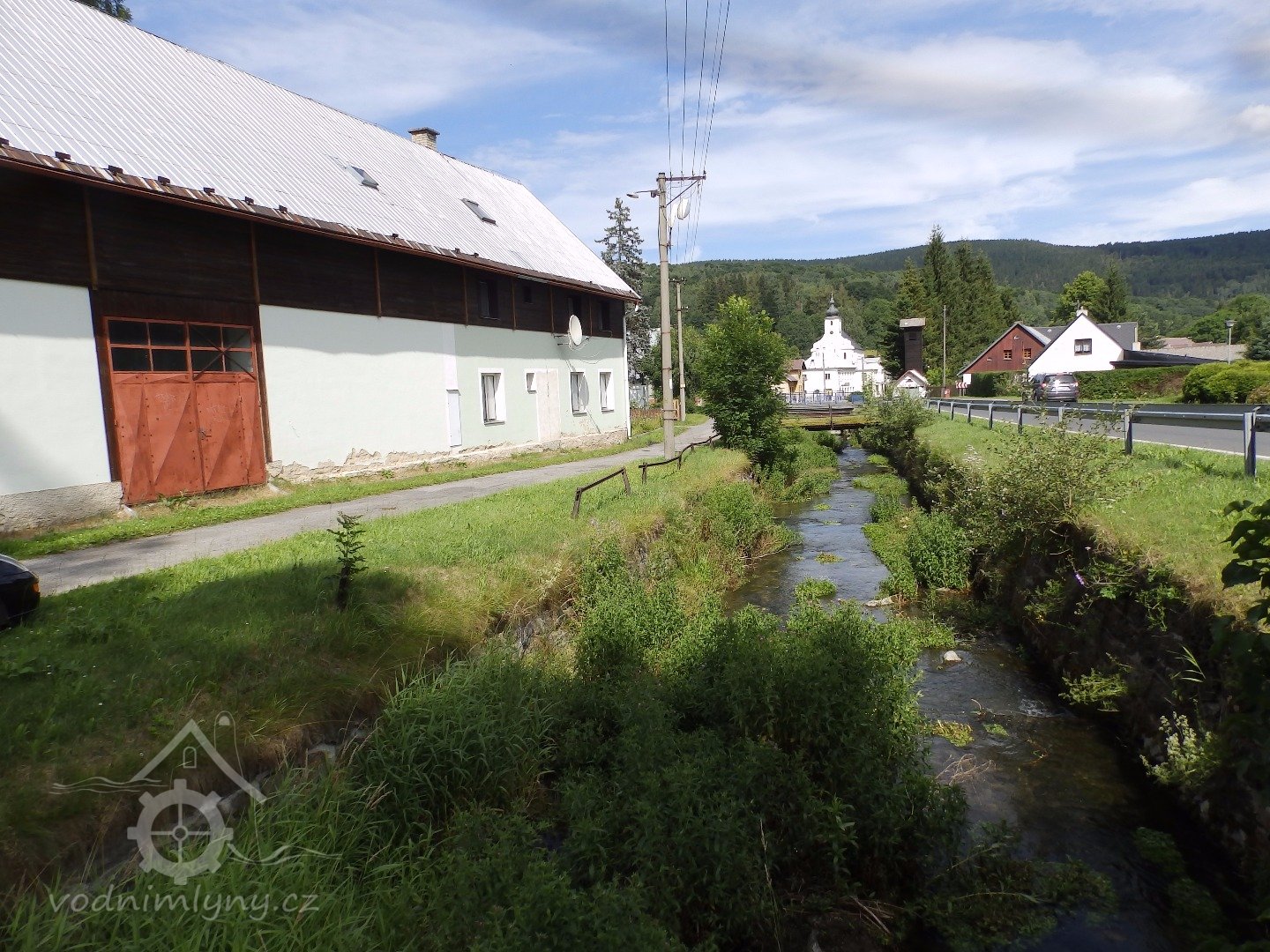 Podlouhlá budova, rovnoběžná s potokem a náhonem.