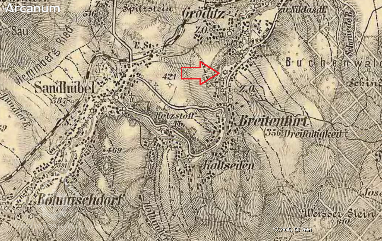 450 m severně od kostela Povýšení sv. Kříže v Širokém Brodě