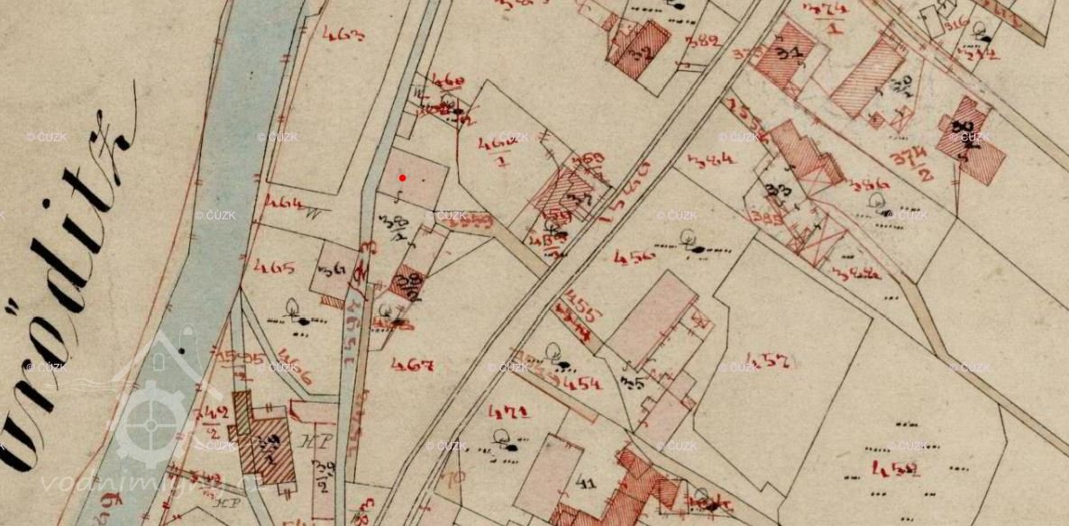 Popis1930: kolo na svrchní vodu, hltnost 0,26 m/s, spád 3,1 m, výkon 7 HP