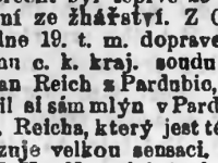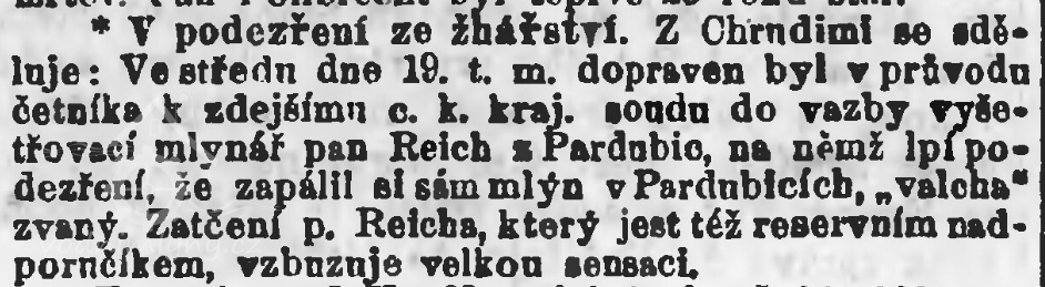 Mlýn v r. 1888 vyhořel, v podezření ze zapálení byl mlynář Reich.