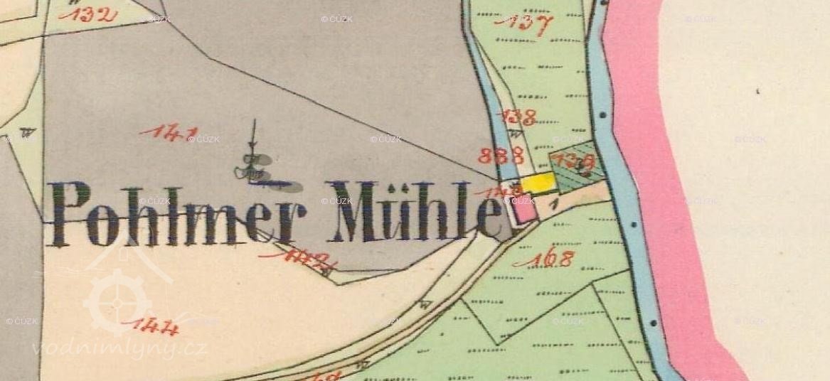 PopisV roce 1930 pohání mlýn kolo na svrchní vodu s průtokem 0.0945 m3/s, spádem 4.2 m o výkonu 3.44 HP.