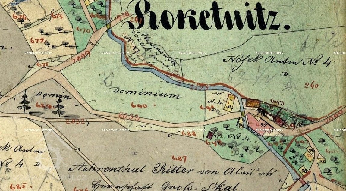 1874: Od více než třiceti roků a až potom napouští se a nažene se rybník Roketnický, vodou každý rok čistící, dvoudělitelný, hned po svatém Václavu, jakmile totiž po tomto svátku dostaví se déšť: Rybník ten vodou v té době napustiti, čili nahnat a vodu pak v takové výši udržovati, aby se k provádění mlýnské živnosti zužitkovati mohla, nevpouštěti ji jinam z rybníka než na mlýn Roketnický, jest povinností velkostatku Hrubá Skála, za jejichž plnění platí se do důchodu téhož velkostatku, od dob pradávných 188 zlatých rýnských a platu toho práv je držitel mlýna č. 4 v Roketnici.