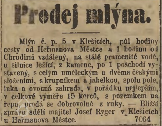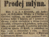 Mlýn byl v r. 1880, za majitele Josefa Rygera, nabízen k prodeji. (RR)