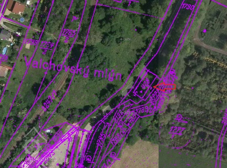Náhon odbočoval z Podolského potoka vlevo ještě na katastrálním území Kostelce u H.M. ve vzdálenosti asi 200 m nad mlýnem. Náhon byl společný pro 4 mlýny v Heřmanově Městci. Valchovský mlýn byl prvním, nejvýše položeným mlýnem. Odtok od něj napájen níže položené mlýny čp. 10, čp. 9 a čp. 26 nalézající se v Židovské čtvrti. Podolský potok se dříve nazýval Zlatý potok.