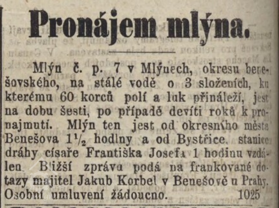 V r. 1877 byl mlýn k pronajmutí, majitel Josef Korbel. (RR)