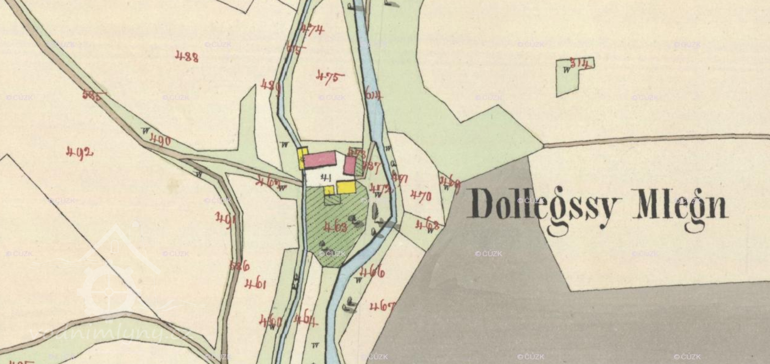 1930: 1 kolo na svrchní vodu. hltnost 0,186 m3/s, spád 3,16 m, výkon 5,1 HP.