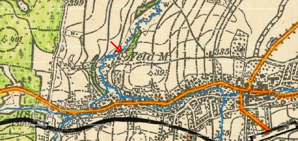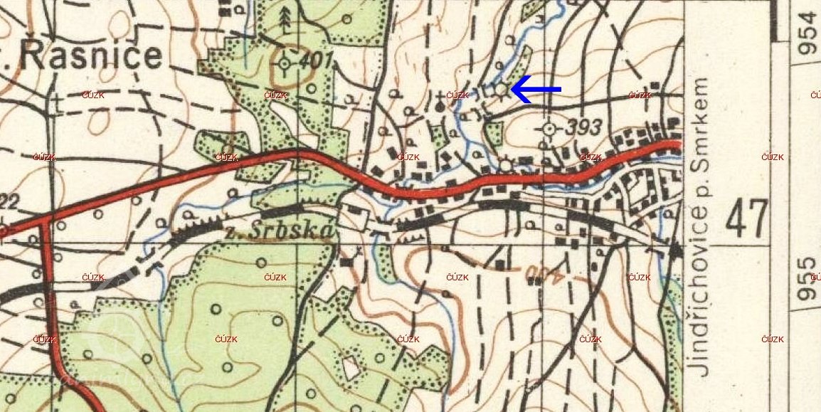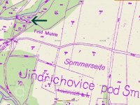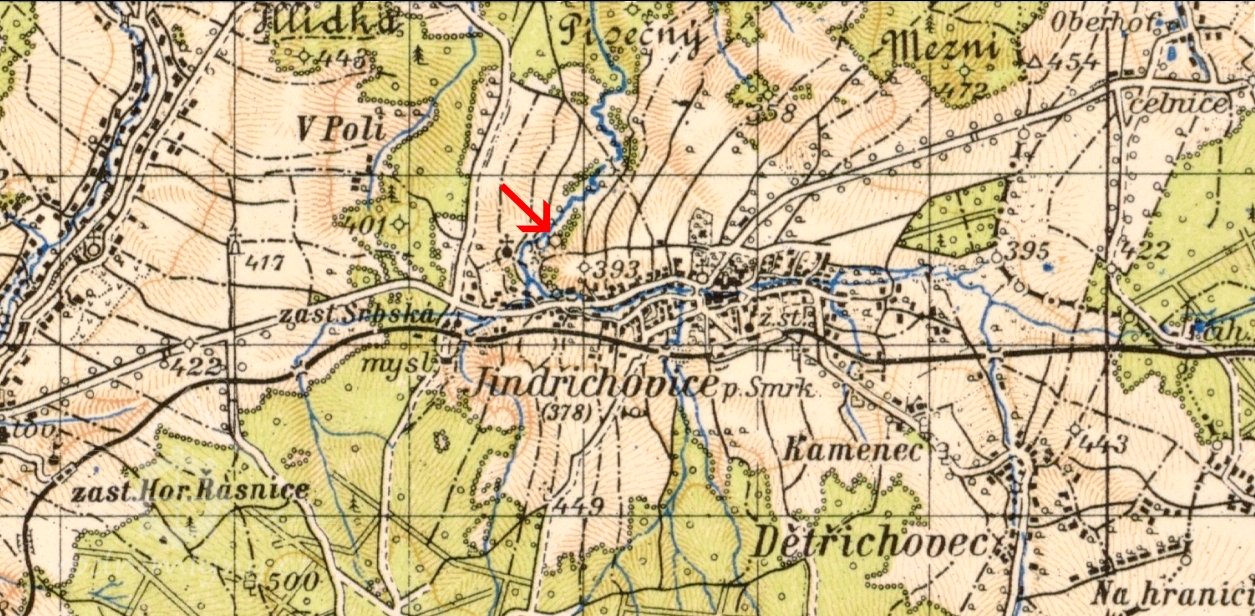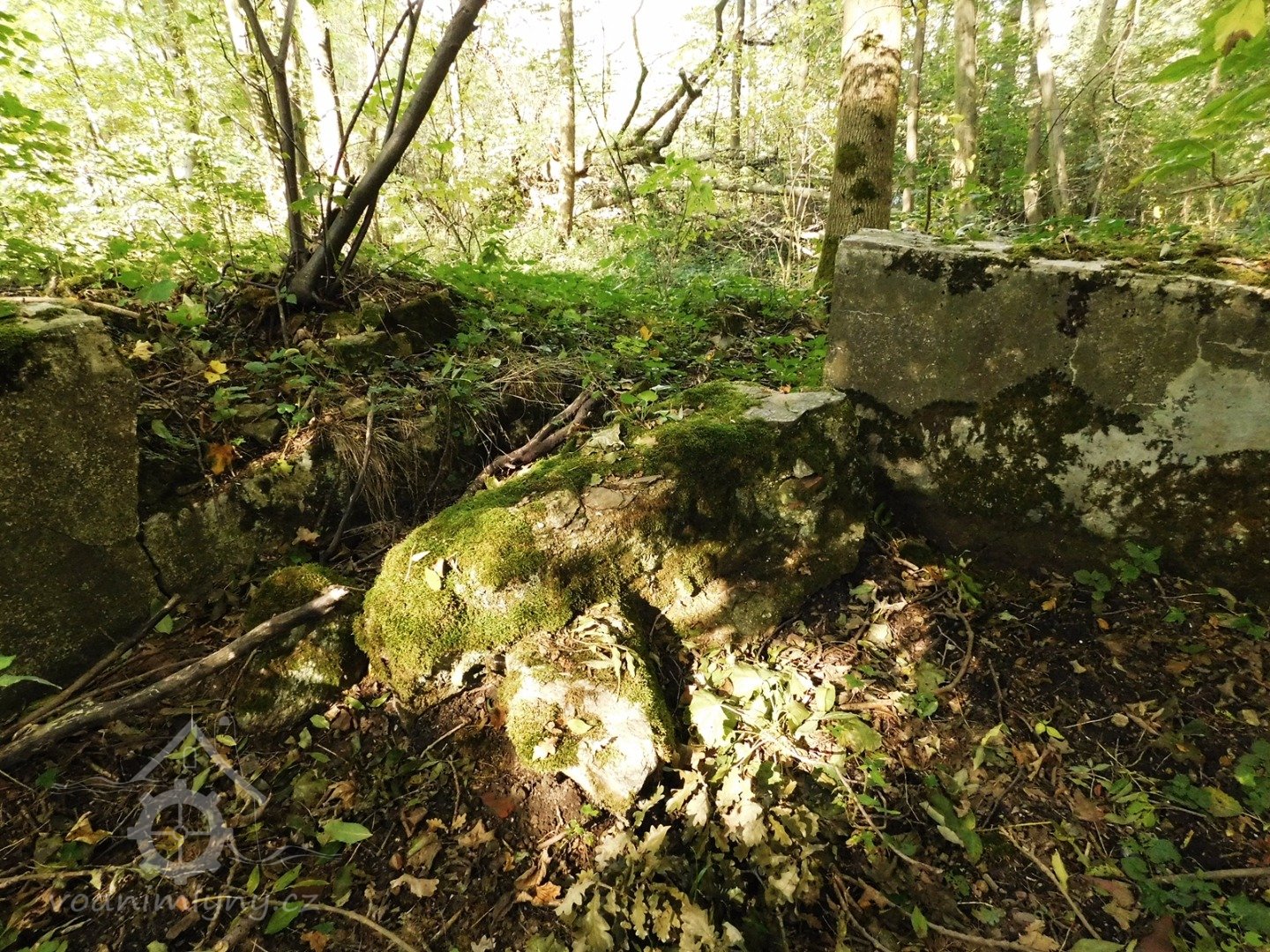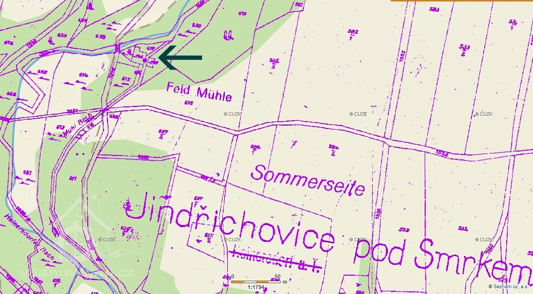 Zničený mlýn v údolí za Jindřichovicemi. Dnes zarostlé místo s relikty mlýna.