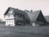 Dnešní obecní úřad, dříve MNV. Zcela vlevo Leskův mlýn, 1955, © Radomír Roup - archiv