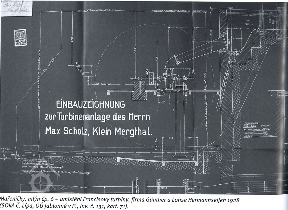 Revize z roku 1934: Francisova turbína firmy Günther & Lohse, hltnost 210 l/s, spád 6,79 m, max. výkon 15 HP.