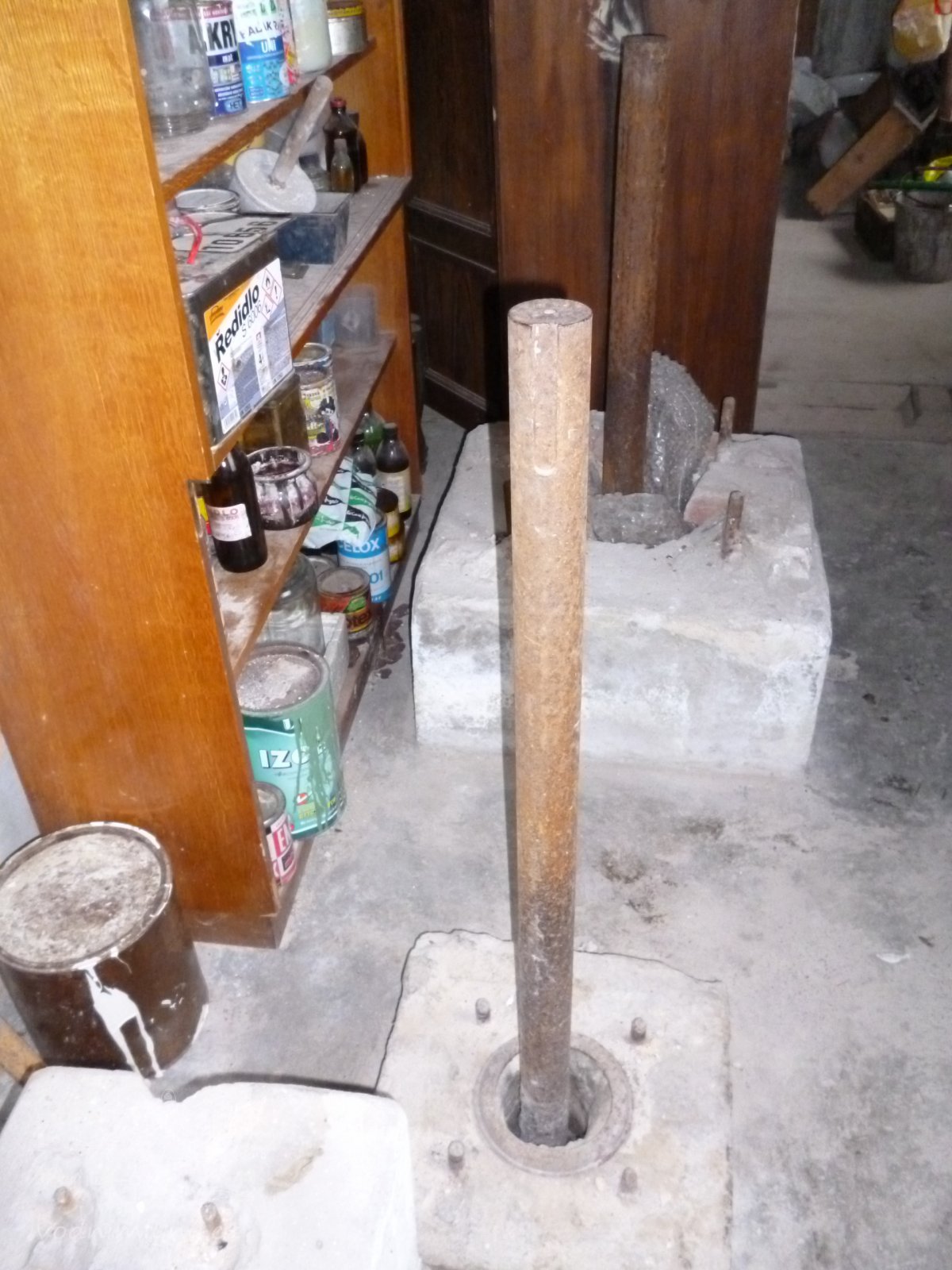 ve zvláštní místnosti v levém rohu od vchodu. Transmise ukotvena pod stropema a od motoru zpřevodována plochým řemenem