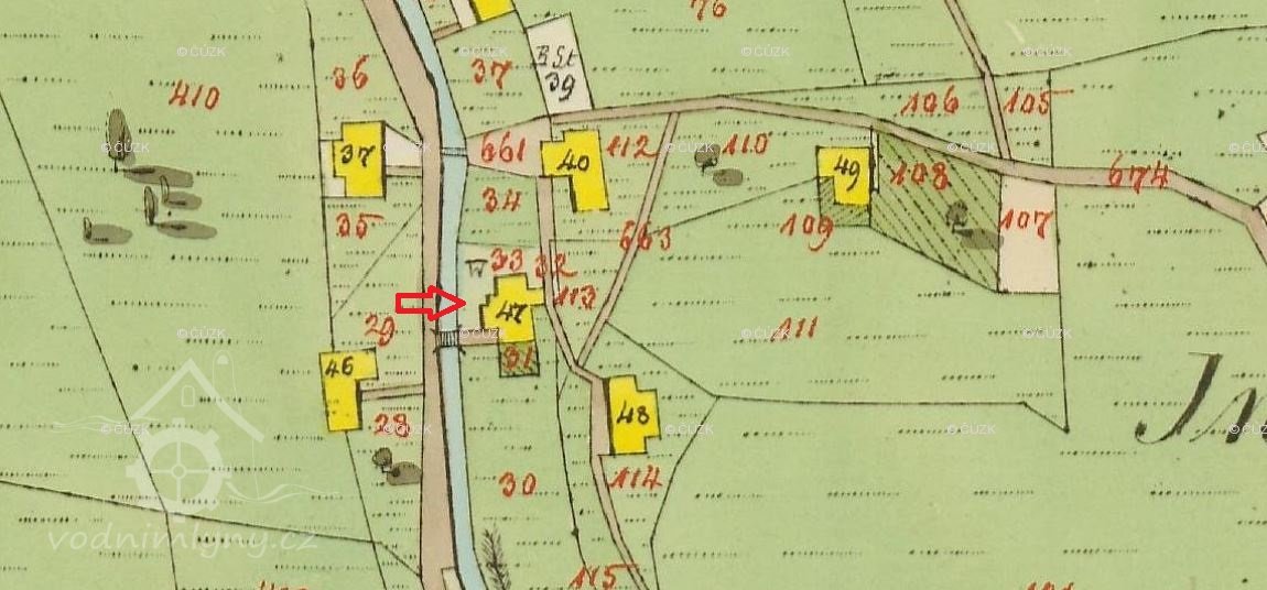 Budova na st. p. č. 47 byla 1843 pouze obytným domem a měla členitější půdorys. Z doby před stabilním katastrem se dochovala roubená druhotně obedněná obytná část.
