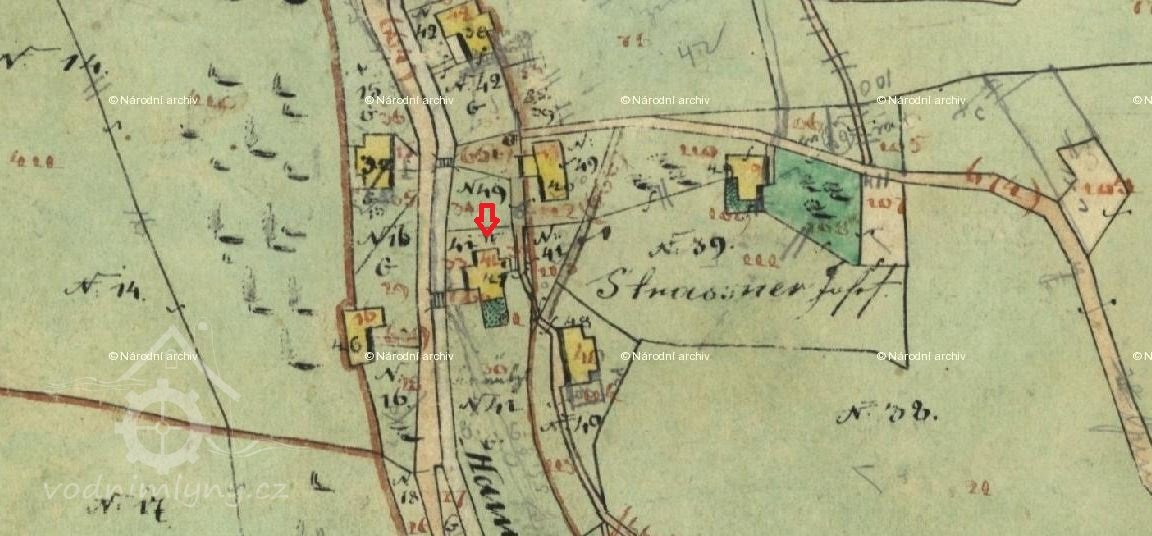 Ve Vodní knize kolem roku 1874 je v tomto objektu uváděn mlýn ve vlastnictví Wilhelma Glutiga. Objekt byl vybaven jedním mlecím a jedním špicovacím složením, které pohánělo jedno vodní kolo na spodní vodu o průměru 6,95 m. V roce 1874 bylo provedeno nové normování vodního díla, cejch byl umístěn na levé nábřežní zdi naproti nároží budovy.