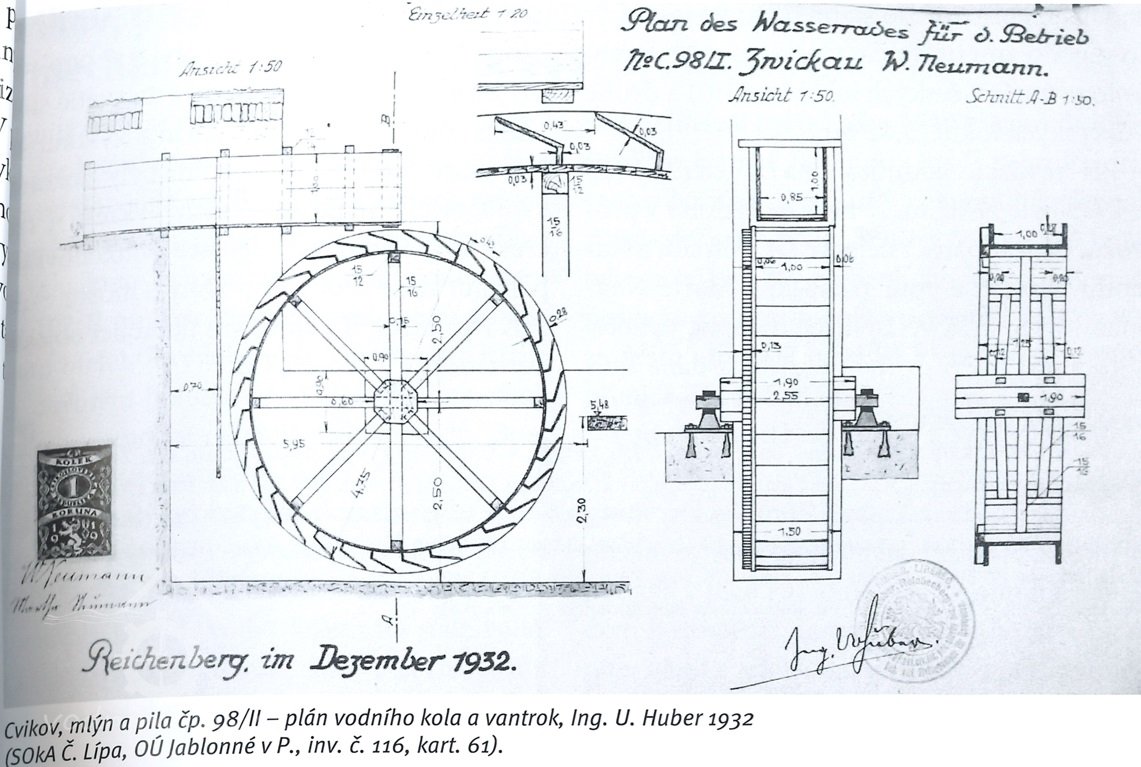 Normování rok 1875 – dvě kola na vrchní vodu u mlýna, 1) prům. 6 českých loktů (4,66 m), 2) prům. 7,5 čes. loktů (5,82 m) a jedno kolo na vrchní vodu u pily, prům. 4,4 m.
