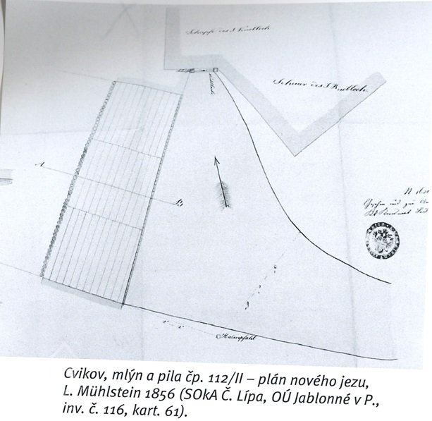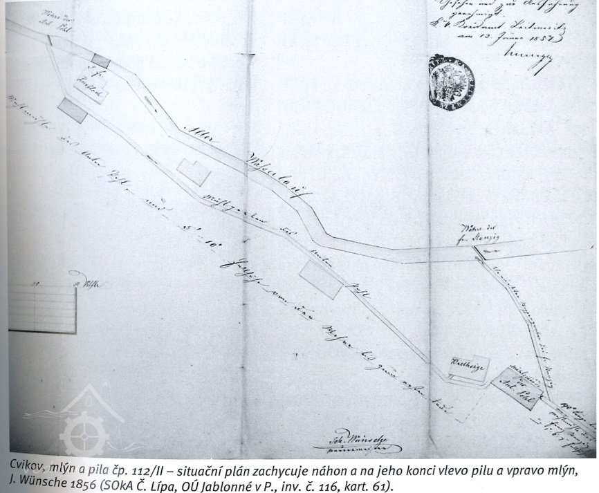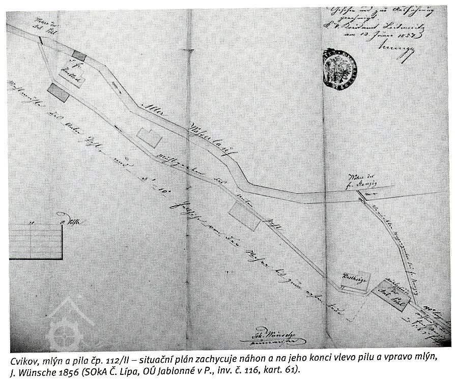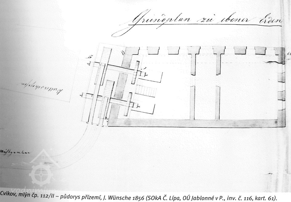 Existence mlýna v tomto objektu potvrdila plánová dokumentace z roku 1856, schválená začátkem roku 1857 Krajským úřadem v Litoměřicích. Plány zachycují existující stavby pily a mlýna, jejich majitelem byl Anton Pohl. Dle plánu vypracovaného zednickým mistrem Johannem Wünschem v roce 1856 byla v lednici osazena dvě vodní kola na vrchní vodu řazená vedle sebe ve dvou úrovních. Ke každému kolu vedly samostatné dřevěné vantroky.