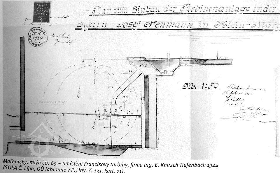 PopisOd roku 1924 Francisova turbína s parametry hltnost 110 l/s, spád 6 m, výkon 6,6 HP.