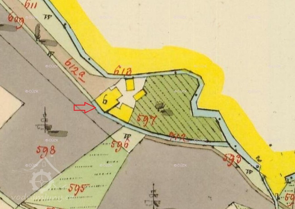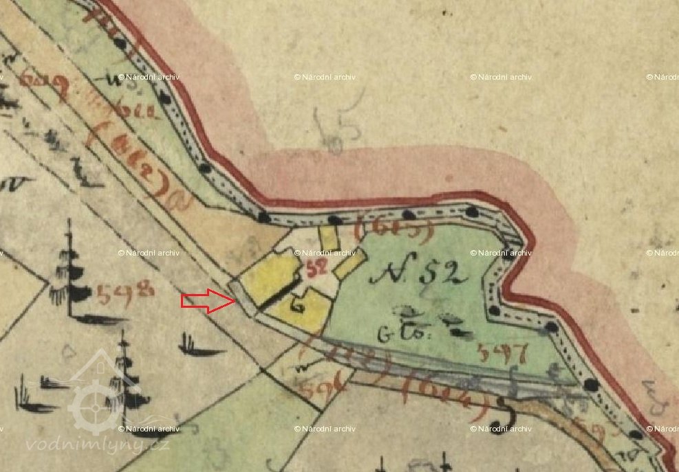 V roce 1843 na mapách stabilního katastru se mlýn objevuji již na katastrálním území obce Mařeničky na st. p. č. 6, ale stále ještě pod starým čp. 52. Začátek vodního díla severně od dnešní silnice patřil i nadále k obci Trávník.