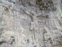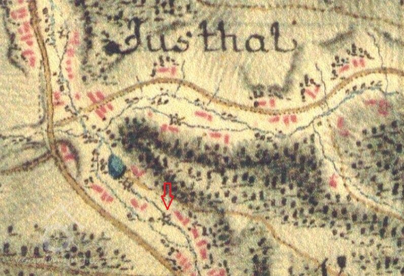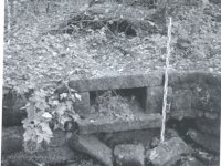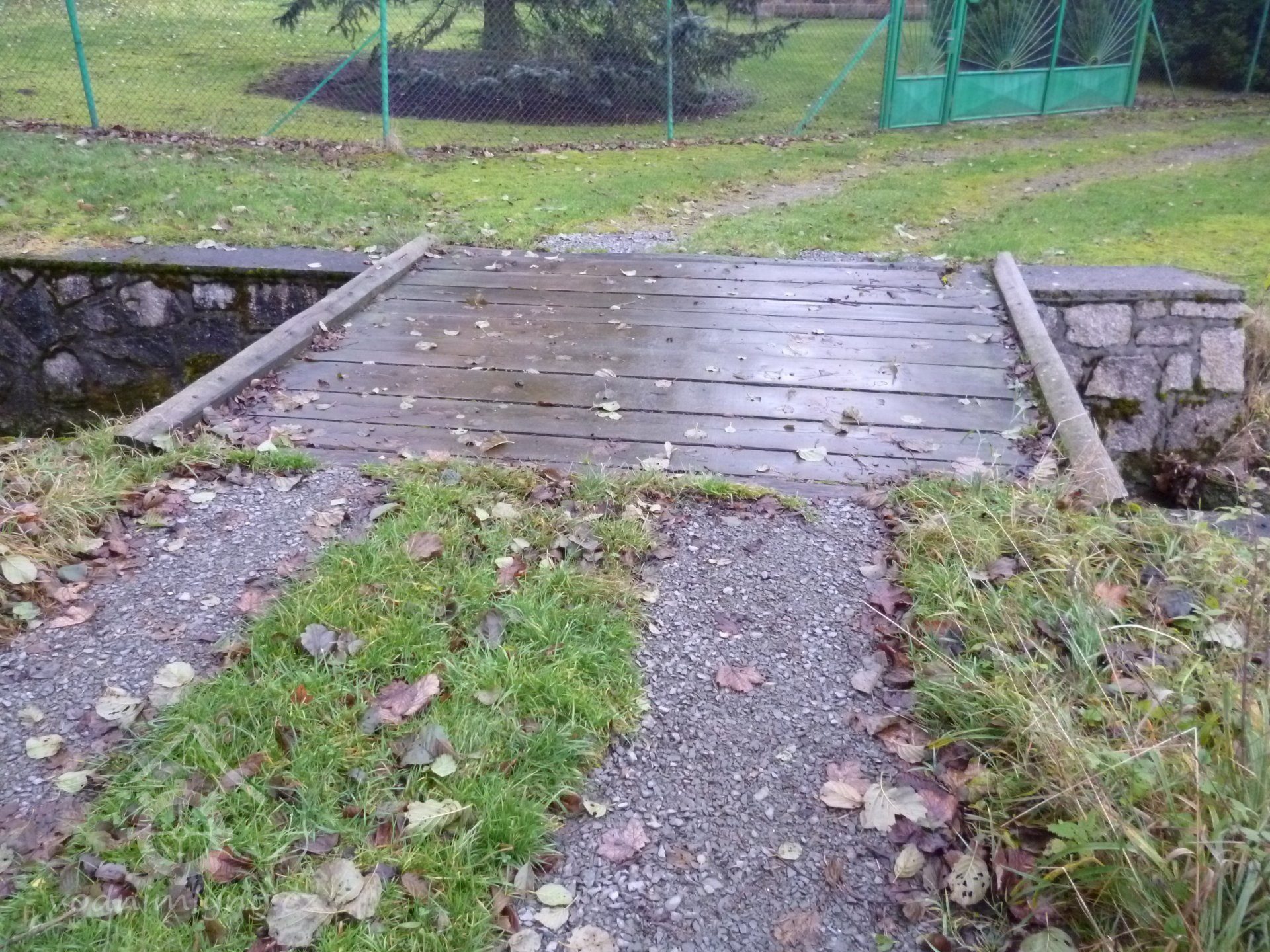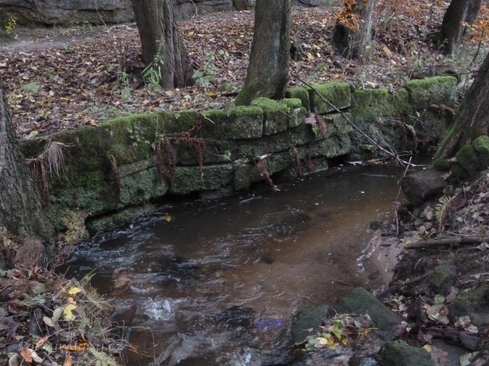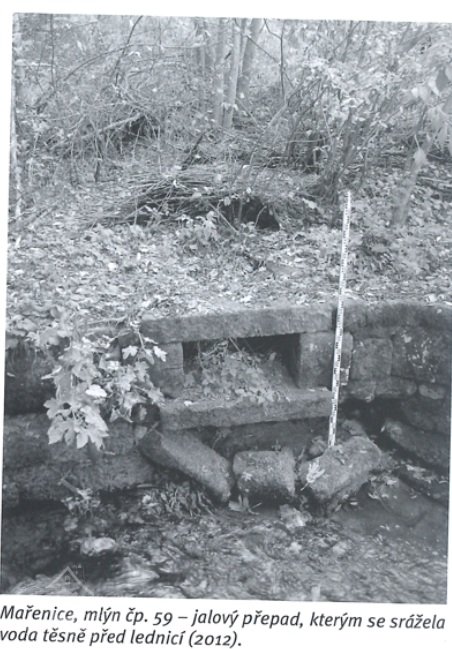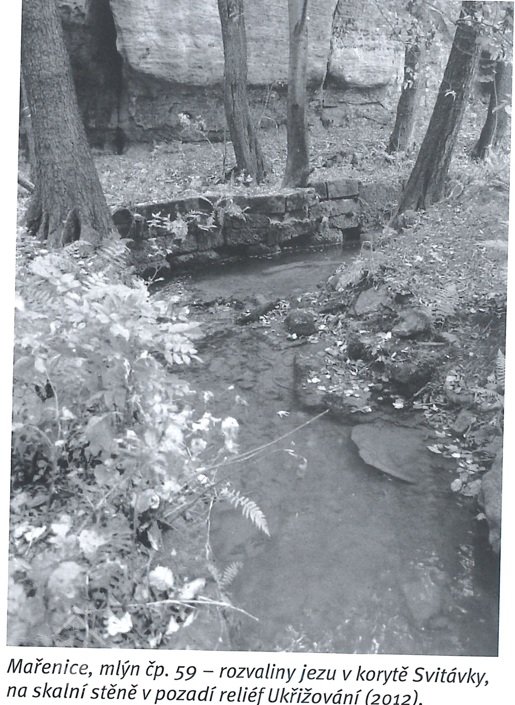 1874 normován- ham osazen do pravého břehu náhonu, na skalní masiv upevněna železná skoba s nápisem "F.K. 1874" (Franz Knobloch), později nahrazena novou s nápisem "G.M.1922", dnes rovněž ztracenou.