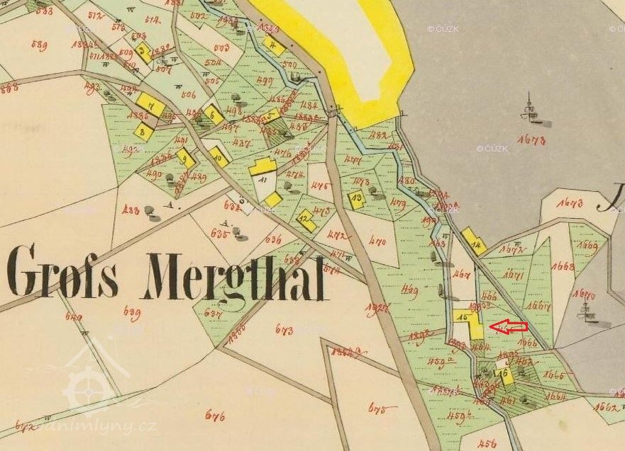 Vodní kniha eviduje v roce 1874 mlýn s jedním mlecím a s jedním špicovacím složením a s vodním kolem na vrchní vodu o průměru 4,5 m. Majitel Franz Knobloch ho koupil již v roce 1859. V roce 1874 bylo provedeno normování vodního díla.