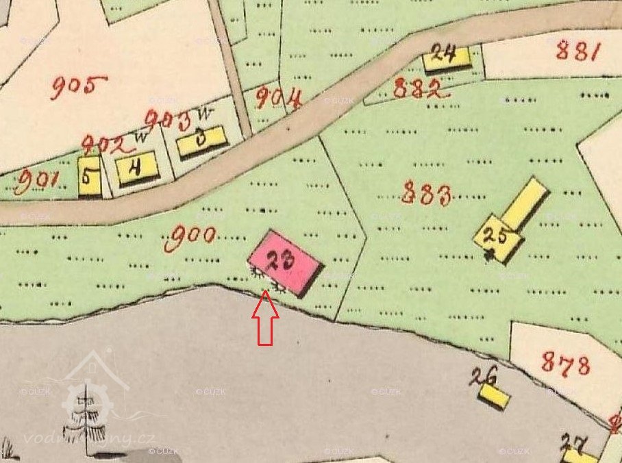 PopisVodní kniha 1874 - vodní kolo na vrchní vodu o průměru 7,82 m a šířce 0,3 m.