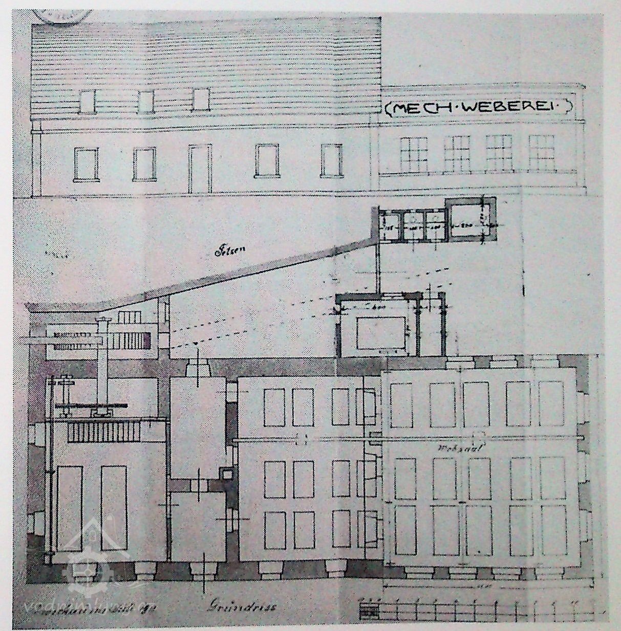 Levý díl zabírala strojovna, na kterou navazoval přístavek lednice s vodním kolem. Pravý díl náležel po přestavbě tkalcovskému sálu s 15 a 12 stavy a trojicí transmisí (původní rozsah sálu byl rozšířen vybouráním původní štítové stěny a vložením podélného průvlaku). Při dvorním průčelí byla plánována přístavba s jedním strojem a za domem nad odtokovým kanálem sociální zázemí.
