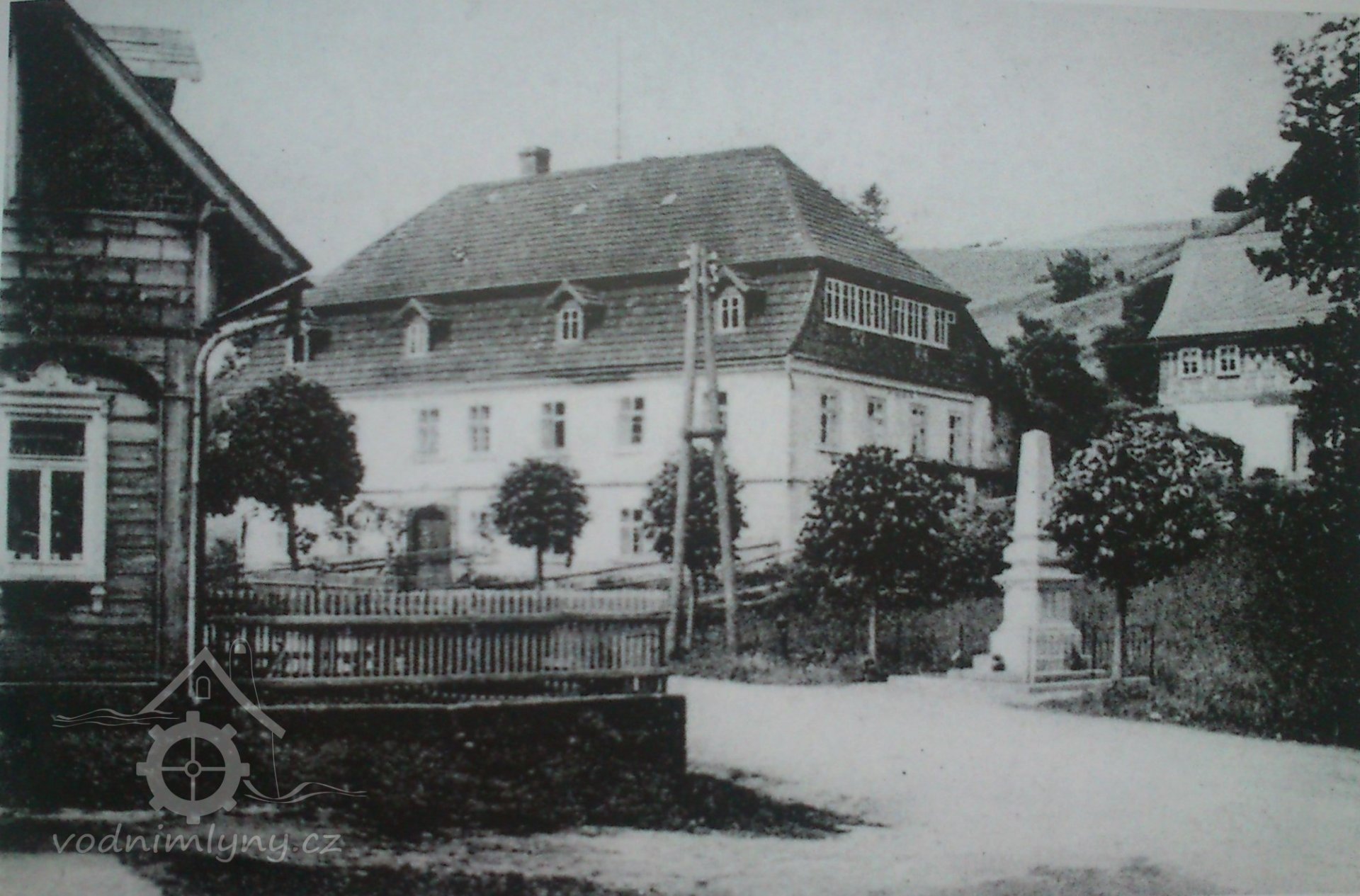 Na půdorysu písmene L. Dle dobových fotografií mohutná patrová budova s vysokou mansardovou střechou s vikýři, patrně z 2. pol. 18. stol. Podle umístění komínového tělesa je patrné, že obytná část se nalézala v levém dílu (při pohledu ze silnice), uprostřed byl kamenným (klenutým?) můstkem přes potok přístupný pískovcový vstupní portál do střední síně, na jejímž konci byla pravděpodovně černá kuchyně. Výrobní část dle výrazného prosvětlení pravého štítu pásovým vícetabulkovým oknem umístěna na pravou dispozice. Tomu odpovídá i rozšíření obdélného půdorysu o přístavbu při zadním průčelí, kde se pod pultovou střechou nacházela lednice s vodním kolem.