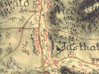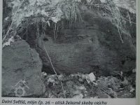 Před zalomením konce náhonu je na přisekané skalní stěně čitelný rámeček pro osazení železné plotny cejchu s otvory pro uchycení. Skoba s nápisem "A.H. 1874" (Anton Hackel) dnes ztracená.