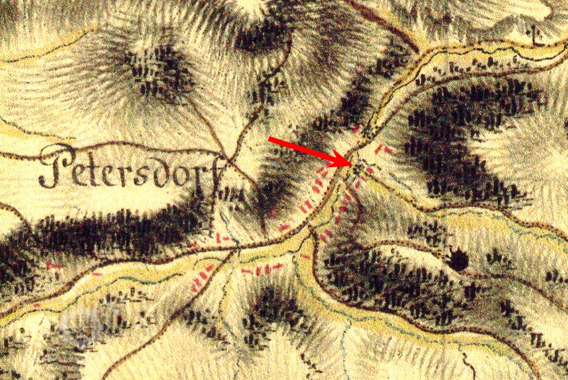 Zaniklý mlýn se nacházel v dnes již zaniklé obci Petrov (Petersdorf) na území Vojenského újezdu Hradiště.