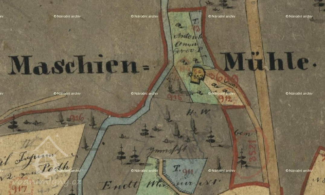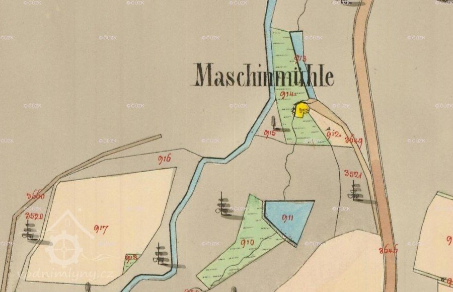 Skalní mlýn, též podle majitele Blažkův mlýn, později tkalcovna Hawel poháněná vodním kolem, později Patzákova tkalcovna. Na císařském povinném otisku z r. 1841 jako Maschinmühle. V té době je psána majitelka Anna Antosch.