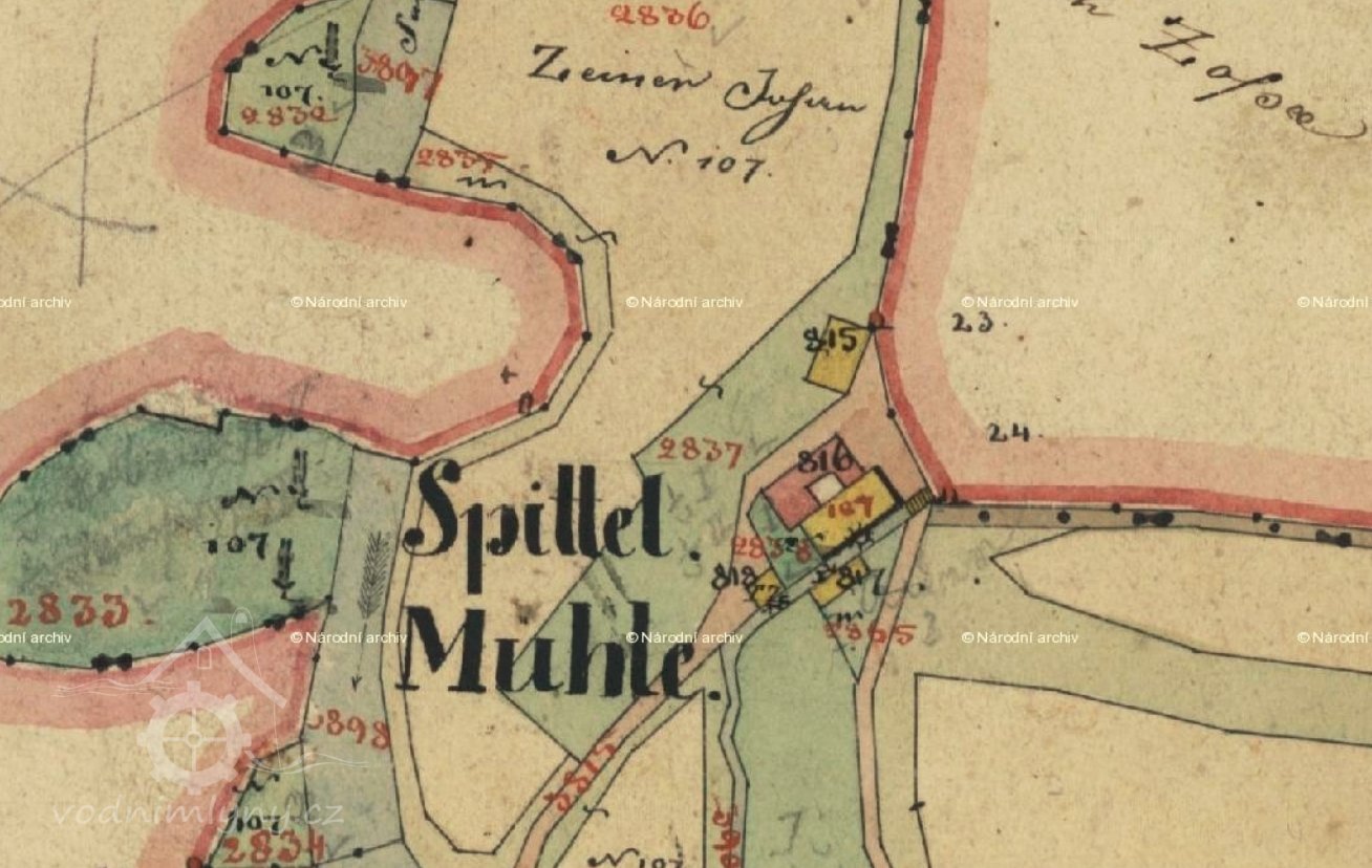 Popis1930: 2 kola na svrchní vodu, hltnost 0,154 m3/s, spád 4,5 m, výkon 6 HP