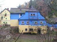 V létě roku 1945 (na národní výzvu o osídlování pohraničí po II. světové válce), zažádal příslušné úřady o přidělení opuštěného mlýna pan Václav Červený I. (můj děda ze strany otce), nar. 28. 9. 1904 v Jaroměří, zemř. 30. 6. 1977 v Komárově, vyučený jako mlynářský tovaryš - za války zaměstnán jako mládek ve mlýně Dvůr Králové n.L. - Verdek. Celý komplex: Mlýn, pekárna a pila včetně okolních pozemků, pole, louky, les, rybníky atd., byl v majetku paní Anny Patzak, která musela vše opustit a jako Němka spadala do odsunu z pohraničí v prvním sledu. Po jejím odchodu projevili o mlýn zájem bratři Sokolíkové. Byli to ale zřejmě jen "zlatokopové", kteří tu pobyli pouze několik týdnů. Údajně vše prohledali, co mělo pro ně nějakou cenu tak odvezli a aniž by vůbec zažádali o přiděleni, tak zase zmizeli. Bezprostředně po jejich odchodu přišel děda s plnou hlavou ideálů. Po pár měsících zkoušek a drobných úprav děda mlýn spustil na stávajícím zařízení. Místní sedláci jezdili s pšenicí k semletí, ale protože jejich finanční možnosti se rovnaly téměř nule a hotovosti nikdo z nich neoplýval, tak v drtivé většině bylo mleti a šrotování na dluh. Systém: Děkuju ti Václave a srovnáme to příště, nemohl zákonitě fungovat dlouho. Tento stav vedl dědu k rozhodnuti, že se mlýn odstaví a po dobu kompletní rekonstrukce bude v celoroční činnosti pouze pila. Předpokládal, že se po dobu odstávky taky trochu zlepší finanční možnosti zákazníků. Zařízení pily bylo v solidním stavu a strojový park měl dostatečně pokrýt tehdejší poptávku po řezivu a trámech na opravy opuštěných a zchátralých usedlosti v okolí, kam se čas od času nastěhovali nově příchozí osídlovatelé. Následovalo období, kdy bylo potřeba namalovat a schválit nějaké plány, vyměnit rozmístění strojů a skloubit veškeré návaznosti. Po vyhotoveni seznamů, přišlo na každodenní shánění všeho potřebného. Veškerá povoleni, dohody o dodání a montáži mlynářského zařízení, dohody o stavebních změnách a úpravách, objednávky řemeslníků na stavbu turbín, betonování vstupních šachet turbín v hrázi rybníka, oprava hráze, vyčištěni rybníka a náhonu, elektromontéry na rozvody atd. atd. Je až nepředstavitelné, že tohle všechno musel děda s tátou obstarat a všechny návštěvy u dodavatelů absolvovat vlakem nebo na kole. Na žně v létě 1947 byl mlýn plně připraven. Rekonstrukce byla provedena vskutku v téměř rekordním čase jednoho roku a několik měsíců. V přízemí byly namontovány 3 válcové stolice, šrotovník, váha a pytlovačky. V patře u vikýře nad vchodem do mlýnice byly nad jednotlivými stolicemi násypky pro obili a po levé straně (při pohledu z průčelí) vertikální válcové zásobníky. V podkroví (na straně k potoku) byla třídička, v hantýrce mlynářů - pláncichtr, což byla v podstatě soustava za sebou jdoucích kmitacích sít o různé hrubosti pláten na třídění zrnitosti mouky (od hladké až po krupici). Z tohoto nejvyššího místa mlýnice byla mouka šupnami sypána do zásobníků v patře a odtud dále do pytlovaček v přízemí. Plevy jako odpad ze šrotovníku a otruby byly sypány do sklepa, do prostor chlévů. Mezi pilou a mlýnem byly v suterénu, cca 3 m pod úrovní hladiny vody v rybníku namontovány dvě Francisovy turbiny s možností spřažení. Znamenalo to, že mohl fungovat jak katr na pile, tak i současně mlýn, každý na jednu turbínu, ale samozřejmě s omezeným výkonem. Pokud bylo potřeba rychle a hodně řezat, nebo rychle a hodně mlít, tak se turbíny spřáhly (skuplovaly) a znásobením síly se vytvořil požadovaný výkon. Pekárna plnila svůj účel jen zřídka. Pekl se pouze chleba a jen jednou v týdnu. Její zařízení si nepamatuju. Vím jen, že dole vpravo byla poměrně velká pec, kterou někdy okolo roku 1960 můj otec zboural, místnost přepažil a vytvořil obývací pokoj. Současně vybudoval pod schody do patra WC. Původní suchý záchod byl až v kůlně za garáží. Dodnes mám před očima to nádherné a řemeslně perfektně zpracované zařízení. Hladkost a slícovanost veškerých bukových prken a latěk kryjících zásobníky, světle žlutou barvu vynášecích dopravníků a celkové bandáže strojů. Lesklou černou barvu v kombinaci s temně bordovou na ocelových a litinových částech stolic, řemenic a soukolí transmise. Vycíděné skleničky odkapávacích maznic na třecích ložiskách hřídelů atd...