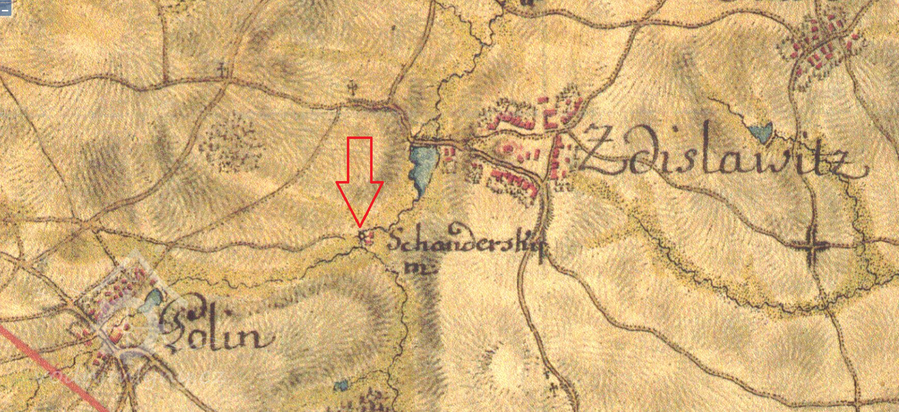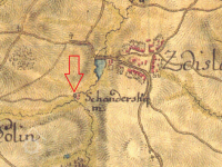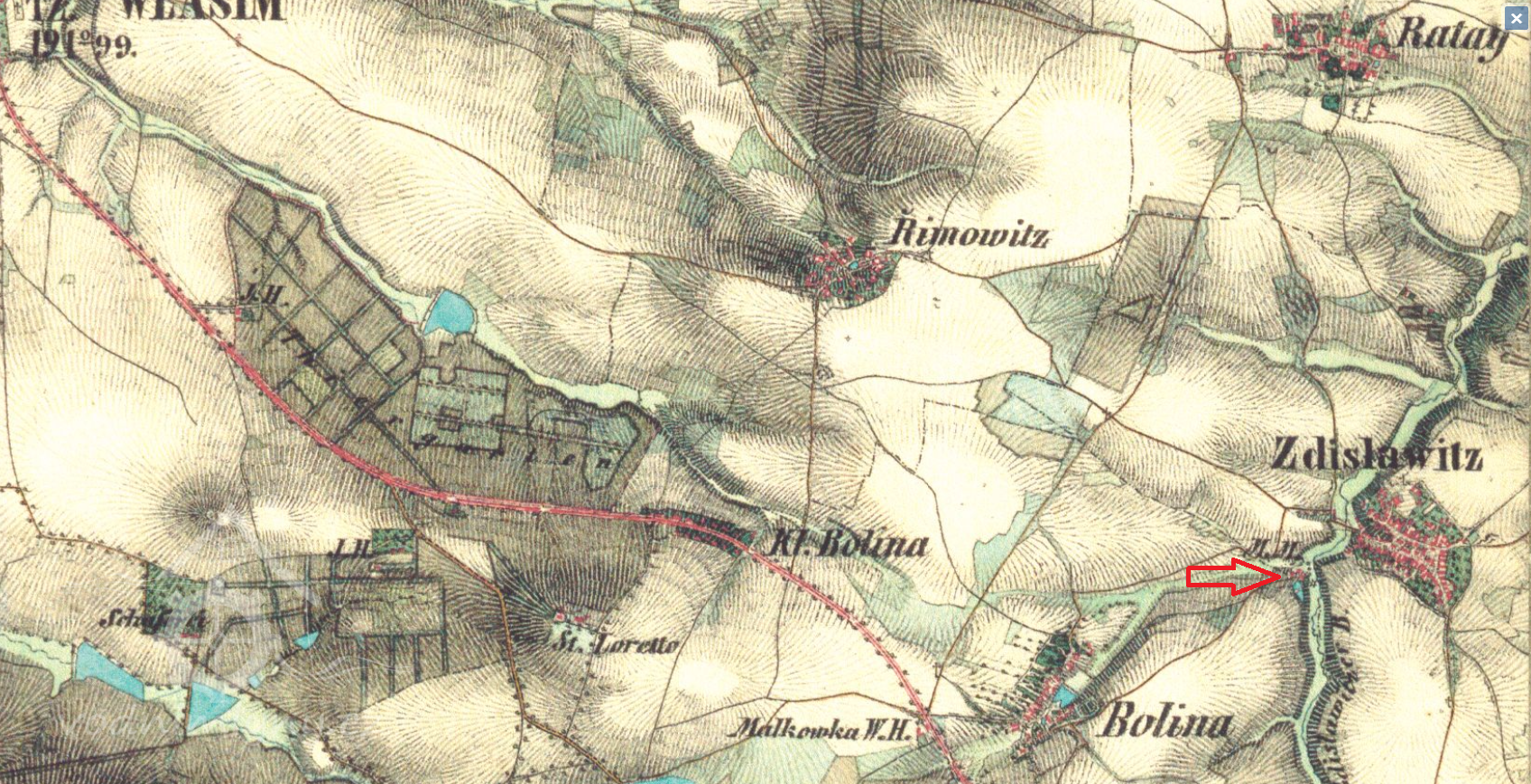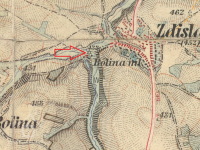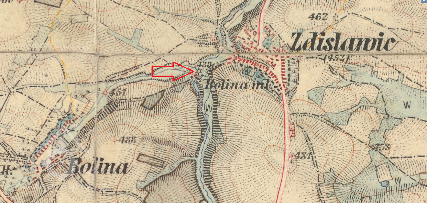 1 km sv od kaple v Bolině, 375 m východně od kostela sv. Petra a Pavla ve Zdislavicích