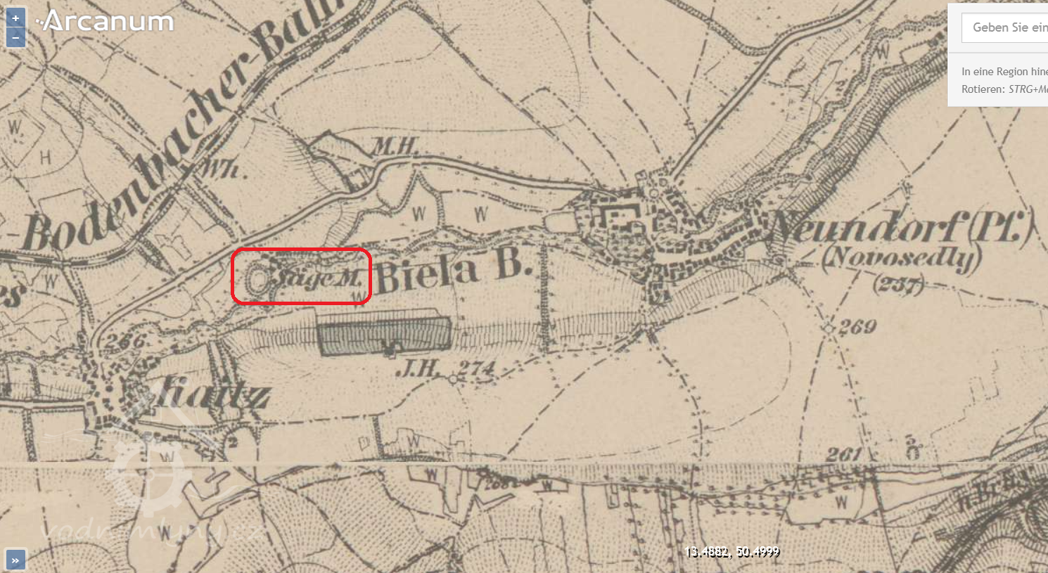 Velký areál, původně vrchnostenská pila, na západním okraji katastru Nového Sedla v sousedství okrouhlého vodního tvrziště. 1930 evidován již jen jako mlýn, stále v držení knížat Lobkoviců, zanikl v roce 1975 s celou obcí Nové Sedlo v důsledku těžby hnědého uhlí.