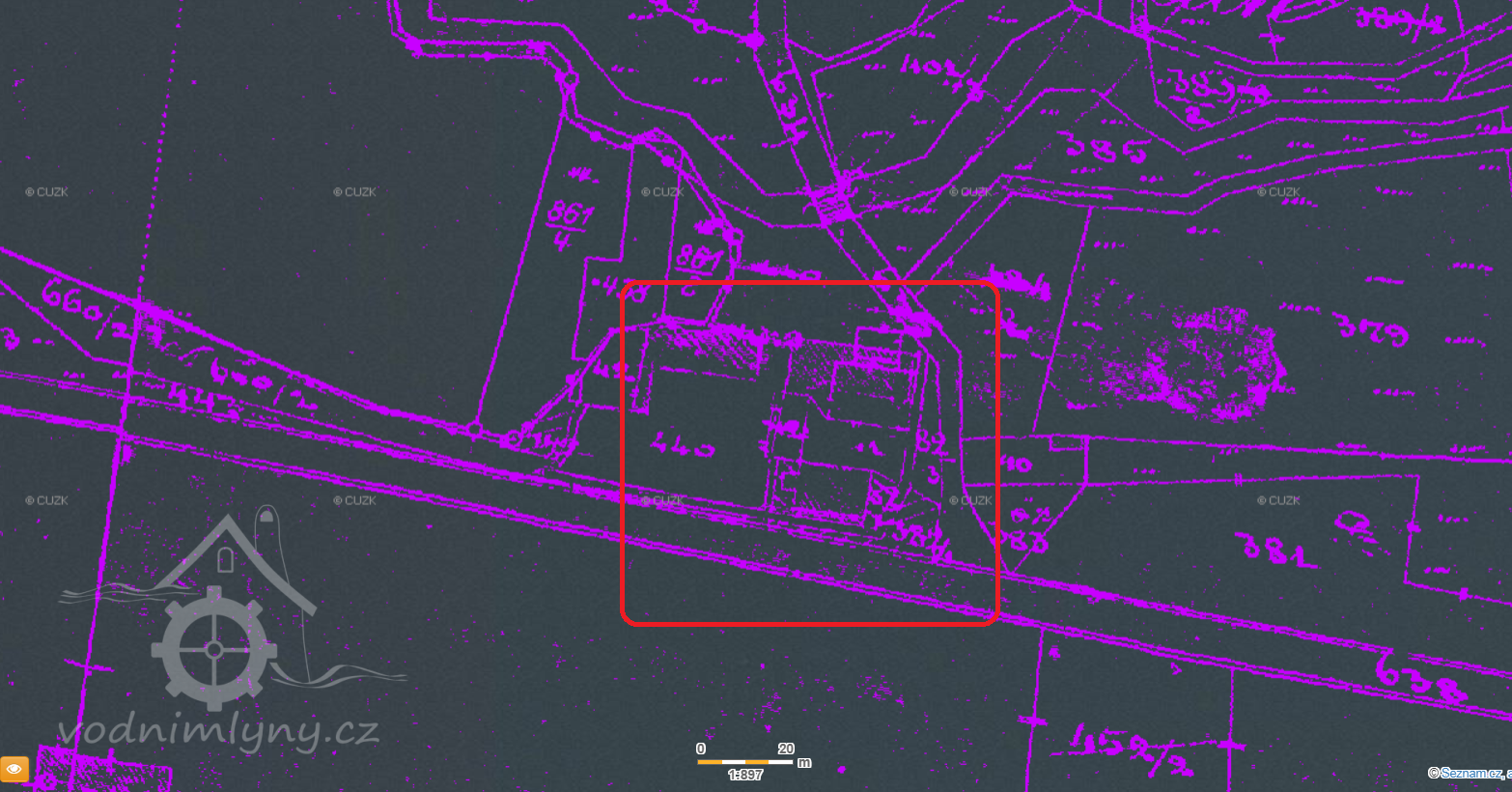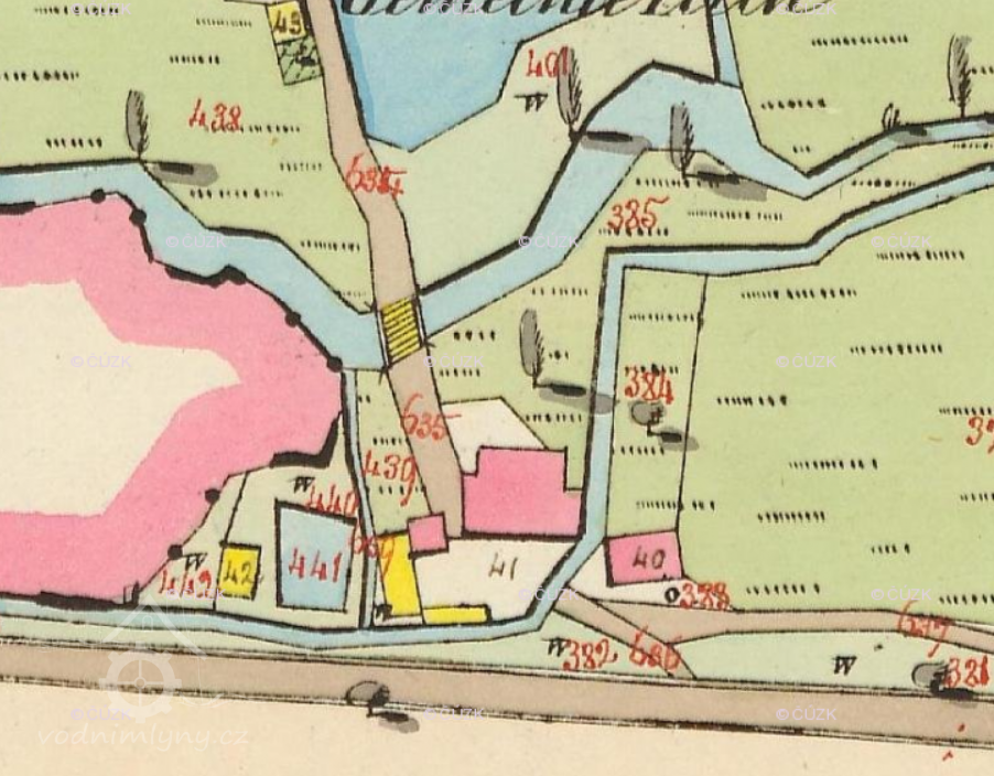 Velký mlýn s pilou průmyslového typu, poprvé připomínán k roku 1579, přestavěn v 2. pol. 19. stol. V roce 1950 již byl zčásti v troskách, mlýniště v roce 1980 zatopeno vodou přehradní nádrže Újezd.