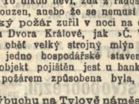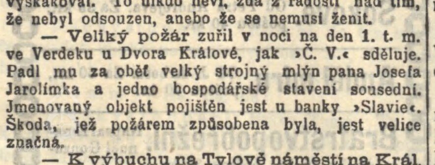 1. srpna 1894 mlýn vyhořel. Spáleniště zakoupil ve veřejné dražbě Ferdinand Jarolímek za 8000 zl. Ten značně zbohatl při pořezu velkého množství dřeva po mniškové kalamitě.