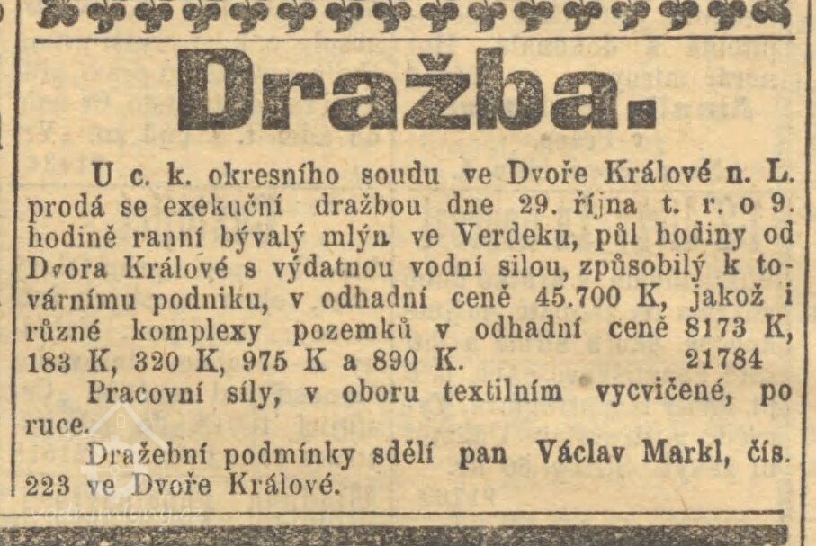 Ferdinand Jarolímek v roce 1902 koupil ve Verdeku u Dvora Králové nad Labem spáleniště mlýna a vybudoval na něm nový dvoupodlažní válcový mlýn, k němuž později přistavěl okružní pilu. Podnik prosperoval a majitel jej roku 1930 rozšířil o tiskárnu látek, později i o barevnu a úpravnu, kde potiskoval šátky ručním i filmovým tiskem. V roce 1940 se společnost účastnila Pražských vzorkových veletrhů, kde získala nové zákazníky – v té době zaměstnávala 60 dělníků a 9 úředníků. V letech 1942–1945 byla výroba přerušena a v části podniku byly uskladněny tkalcovské stavy firmy Mandl. V říjnu 1945 byl podnik převeden na Ottu Jarolímka, syna původního majitele, o rok později se podařilo obnovit výrobu. V roce 1948 znárodněný závod převzaly Textilní tiskárny, úpravny a barevny (pozdější Tiba n. p.). V továrně sídlí textilní společnost zabývající se potiskem, úpravou a konfekcí textilu.