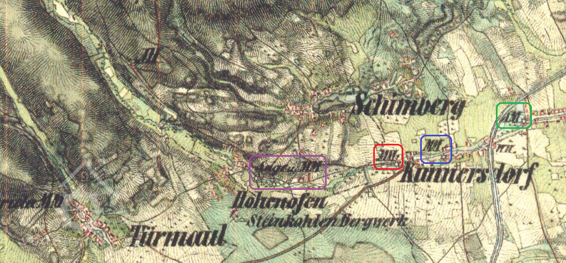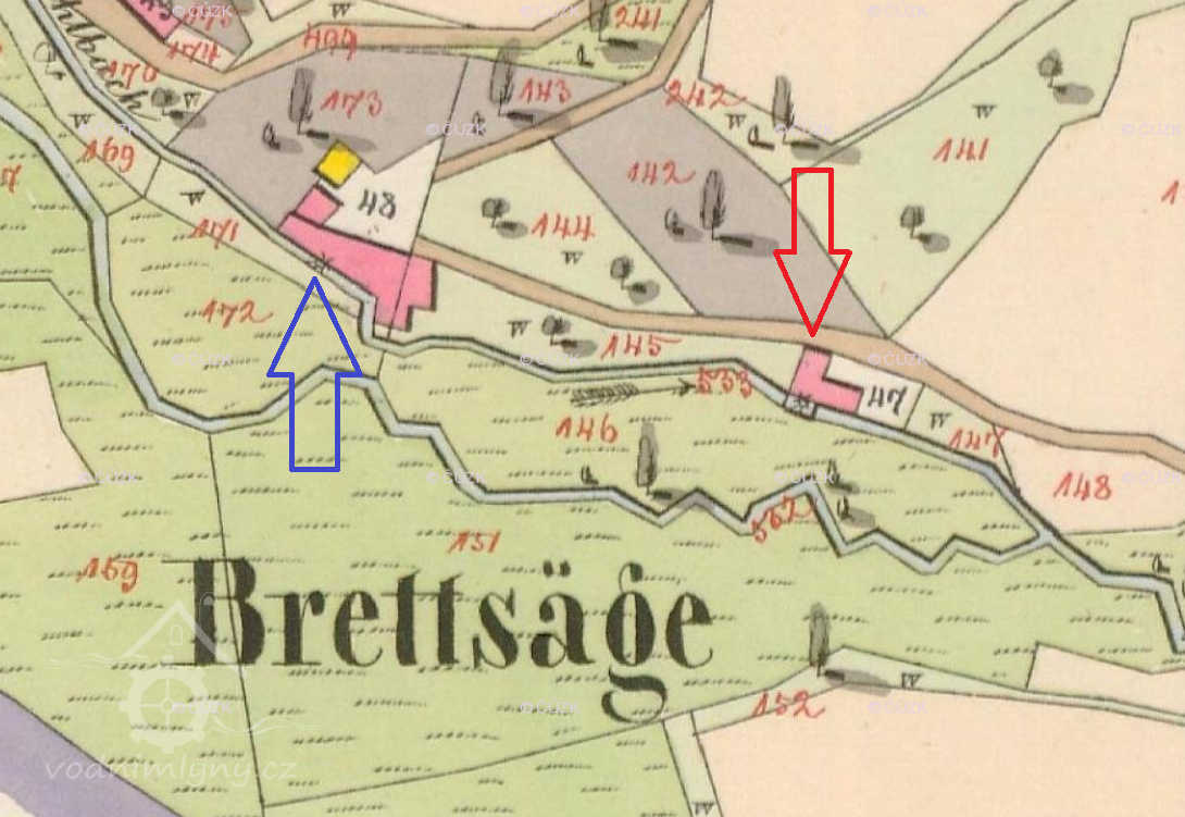 1840 majitel Vavřinec Schärf (mlýn), František Schärf  (pila)