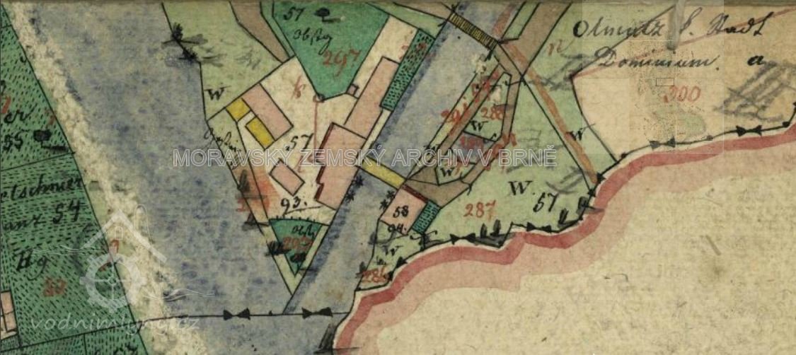 Za dnešním Kojeneckým ústavem na Nových Sadech, na umělém náhonu vyvedeném z hlavního toku řeky Moravy v místech jejího esovitého zaoblení a regulovaném mohutným jezem, se od vybudování olomoucké tereziánské pevnosti nacházel na jedné straně náhonu měděný hamr (pozdější č. 58) a na druhé straně pak od r. 1759 městská papírna (pozdější č. 58). Obě zařízení byla v druhé polovině 18. stol. přebudována na mlecí obilní mlýny.